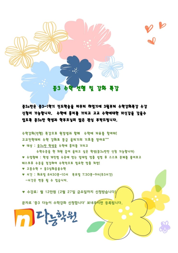 수학 학습은 학생들마다 부족한 부분과 강화해야 할 부분이 다르지만, 우리 다능학원에서는 적절한 시기에 학생들에게 본수업 이외에 추가로 최적의 학습을 1:1과외식으로 제공하여 효율적이고, 도움이되는 수학 학습을 만들어 줍니다. 고교 수학에서도 경쟁력을 갖출 수 있도록 학생들을 관찰하고 필요한 시점에서 특강을 진행합니다. 저렴한 특강 수강료로 정교하게 실력을 강화 시킬 수 있는 기회를 제공하지요!! 이번에도 고교입학 1년을 남겨두고 수학 선행및 강화 특강 특강을 열었으니 귀중한 시간 소중한 수업이 되어 고교수학을 준비 하자^^ 해마다 선행특강으로 수학에 더욱 흥미가 생기고, 수학 수준을 한차원 끌어 올렸다는 이야기를....... <img src="https://blogthumb.pstatic.net/MjAyNjAyMjZfMTc0/MDAxNzcyMDg5NzA4ODE3.IKMIPeCYkXSaf6e_yhEJ7INOLKNqzl24fjtjEaIaZHQg.QO0rYbf2kBk-kf1Y9U4Wy2aFG28Ac4JyPWrK5thd710g.JPEG/%C1%DF3_%BC%F6%C7%D0%BD%C9%C8%AD%C6%AF%B0%AD.jpg?type=s3" />