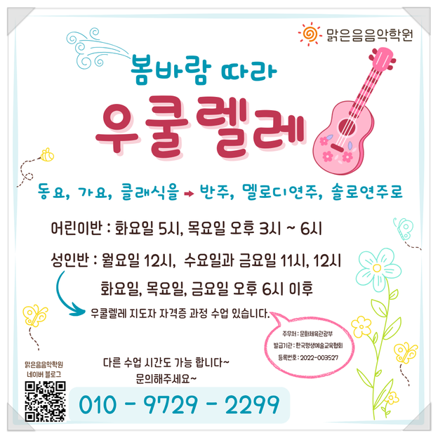 안녕하세요~ 수원 정자동에서 피아노와 우쿨렐레를 수업하는 맑은음음악학원입니다~ ^^ (교육청 등록 5546) 2026년 3월 ~ 5월 까지의 우쿨렐레 수업 안내입니다~ ♪ 우쿨렐레 수업은 주 1회, 그룹수업입니다. - 어린이, 청소년반 주 1회 우쿨렐레만 수업 = 80,000 (월 4회) 피아노 수업 + 주 1회 우쿨렐레 수업 별도 = 피아노 + 40,000 - 성인반 주 1회, 월 4회 : 80,000 ( 최대 4명까지 그룹수업) 우쿨렐레 지도자 자격증 과정 수업 있습니다~ ♪ 우쿨렐레 그룹이 만들어지지 않은 경우에는 개인 레슨 20분 + 연습으로 진행됩니다. (현재 수요일 오전 11시 30분 성인 우쿨렐레 기초반 수업 충원합니다~) 우쿨렐레는 크기는 작아도 멜....... <img src="https://blogthumb.pstatic.net/MjAyNjAyMjZfMTkx/MDAxNzcyMTE3OTIyODYw.-gWslZNGJGn49WRyTsa-GV3cYfIE1HcFHMSWW02bGMsg.a7sspI5S6ASgQmcbdMlE6aYMpzirmDdkkMYsXM3XaKog.PNG/%BF%EC%C4%F0%B1%A4%B0%ED_%BA%BDSNS_26.png?type=s3" />