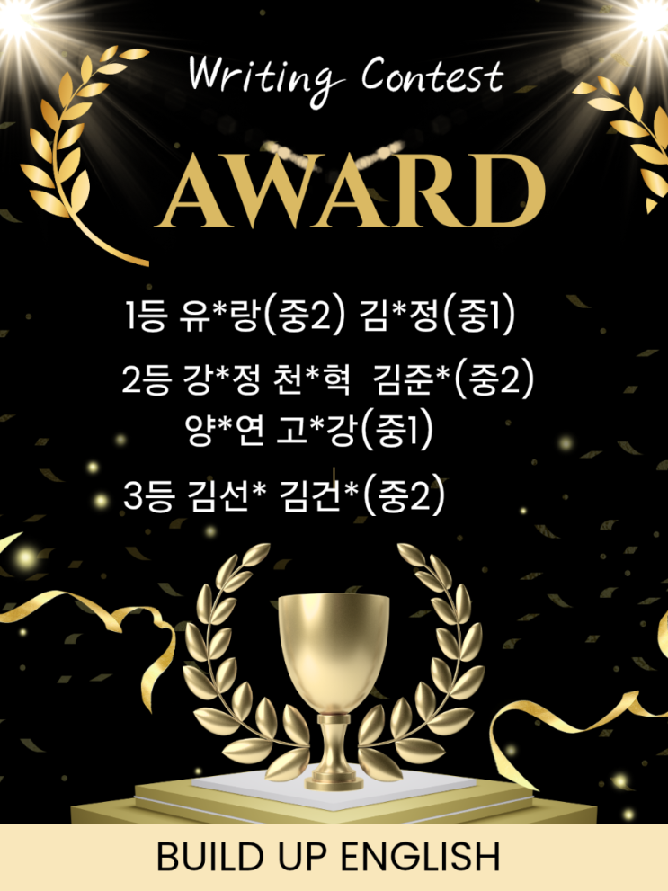 #천천동#비욘드#정천초 #푸르지오 #빌드업 빌드업 중1~2 친구들의 2026년 상반기 Writing Contest가 실시되었습니다. 중학교 수행평가와 동일한 조건으로 진행했습니다. 중1때부터 시작해서 세번째 글을 쓰다보니 한글 에세이부터 완성도가 높은 친구들이 많았어요. 최대한 번역기에 의존하지 않고 자신의 힘으로 영어대본을 완성한 모습이 아주 기특했어요~! 이번에 더 잘 할 수 있는데.. '정성이 부족한' 글쓰기를 한 친구들~ 가을에 있을 하반기 Writing Contest에서는 잘 해주리라 믿어요! Writing Contest의 수상자를 소개합니다! 너희들의 열심과 성실함을 칭찬해! 중2 1등 수상자 글 (유*랑) 주제: My Future Dream 문법 : to 부....... <img src="https://blogthumb.pstatic.net/MjAyNjAyMjdfMjEg/MDAxNzcyMTYyOTk3NDY1.j8dl78G0ZsxK9py4kdOUq48H4gGxjCANazwQo4xesYUg.wJHuuaxrwVpweJUJVtE-AALDbxpjiXVGk1afD8b4I1sg.PNG/900%A3%DFBlack_and_Gold_Elegant_Company_Award_Ceremony_Instagram_Post%A3%DF20260227%A3%DF12.png?type=s3" />