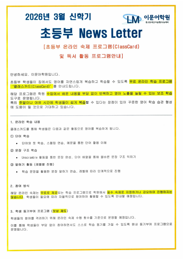 [ 초등부 ClassCard & 독서 프로그램 안내 ] 안녕하세요. 이문어학원입니다. 요즘 아이들 보면 핸드폰을 손에서 놓지 않는 모습, 많이 보시죠. “조금만 덜 보면 좋겠는데…” 라는 생각, 저희도 똑같이 했습니다. 그래서 고민했습니다. 막는 게 아니라, 바꿀 수는 없을까? 그래서 시작했습니다 – ClassCard 초등부에서는 클래스카드(ClassCard)를 활용한 온라인 단어 학습을 진행합니다. 단어 뜻을 익히고 스펠링을 쓰고 게임처럼 반복하면서 기억하는 방식입니다. ✔ 아이들에게는 → 게임처럼 재미있는 학습 ✔ 부모님께는 → 의미 있는 시간 활용 핸드폰을 보는 시간이 조금씩 공부 시간으로 바뀌게 됩니다. 수업 외 시간까지....... <img src="https://blogthumb.pstatic.net/MjAyNjAzMThfOTAg/MDAxNzczODI4ODk0Nzgw.k5Go9O1HGKtuViy0N2pOvWMxDxnRz90auuS82ZN0ONEg.WbdRlyU2LBUtoJRFRfN1z7I6oVPNZlY9P_iCEJE7bkQg.PNG/image_%281%29.png?type=s3" />