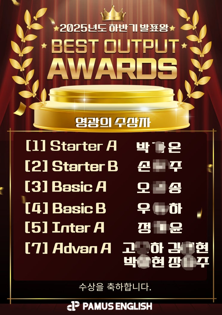 안녕하세요. 파머스메타국제어학원입니다. 아이들의 성장은 시험 점수 한 번으로 평가할 수 없습니다. 매일의 작은 습관, 반복되는 연습, 그리고 포기하지 않는 꾸준함이 쌓일 때 비로소 눈에 보이는 변화가 만들어집니다. 2025년 하반기 동안 파머스메타국제어학원에서는 아이들이 영어를 외우는 공부가 아니라, 이해하고 표현하며 스스로 성장하는 학습을 경험할 수 있도록 지도해 왔습니다. 그 노력의 결과로 이번 하반기 Best Output Awards(발표왕)와 META Reading King(다독왕) 수상자가 최종 선정되었습니다. 영어는 ‘입 밖으로 나올 때’ 실력이 됩니다 많은 학생들이 영어를 오래 공부하지만 막상 말하거나 발표해야 하는 상황에서는 어....... <img src="https://blogthumb.pstatic.net/MjAyNjAyMDlfMjAg/MDAxNzcwNjI5MDcyNzEy.11U7TfOjmgrDh33YpEnNP6zlb4Pu1qcOHUnhzV5QpHsg.MZQsAH92dUtALJh2a2iRhdcmSiCsxPvPxsBsomYwoEMg.JPEG/2025-%C7%CF%B9%DD%B1%E2-%BE%C6%BF%F4%C7%B2_%B8%AE%B5%F9%C5%B7-%BC%F6%BB%F3%C0%DA-%C6%F7%BD%BA%C5%CD-001.jpg?type=s3" />