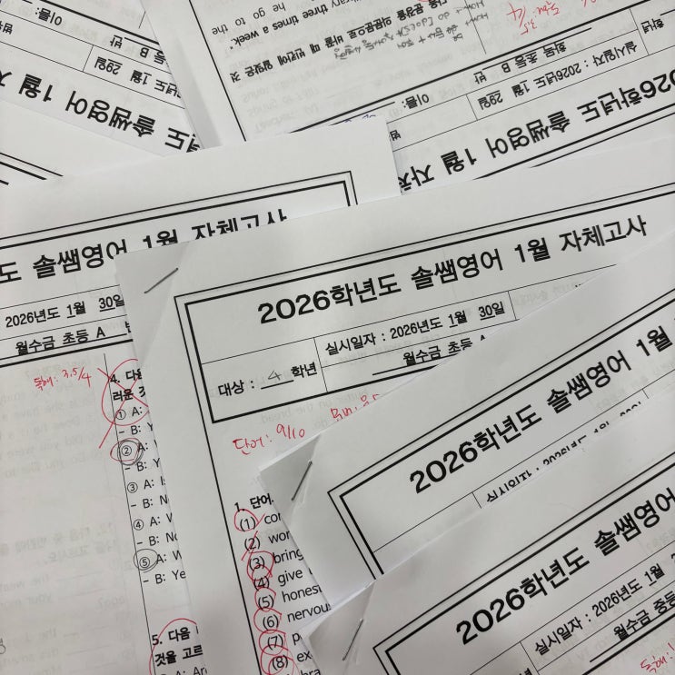 안녕하세요-! 솔쌤입니다ㅎㅎ 저희 솔쌤영어는 매월 마지막 주에 월말평가 보는 것, 알고 계시죠? 각자 한 달동안 배웠던 어휘, 문법, 독해 범위에서 20문제가 출제됩니다. 요즘 트렌드에 맞게 서술형도 나오구요, 학년이 높을수록 독해는 단순 해석이 아닌 지문 속에서 여러가지 정보를 찾아 풀 수 있는 그런 복합적인 문제를 출제하려고 노력하는 솔쌤입니다^^♡ 시험 결과는 매월 초 어머님들과 학생들에게 문자 전송이 됩니다. 오답이 너무 많은 친구들은 단원에 대한 연습이 충분치 않다고 생각하여 복습이 들어갑니다. 빈틈은 죽어도 허락 못하는 솔쌤.. 구멍 다 메워주게써!!! 열심히 월말평가를 보는 학생들ㅎㅎ 그 열정이 너무 뜨거....... <img src="https://blogthumb.pstatic.net/MjAyNjAyMTNfODkg/MDAxNzcwOTc2MjM2MjQ3.k9WGtJSACmuxdNJtCYdek7BiiGdMXchzJ8bTgJzh1A4g.aaYm3zNLh69PV7dsASXr6MA1klPPehhNvih8Es3wXQog.JPEG/KakaoTalk_20260213_150000064.jpg?type=s3" />