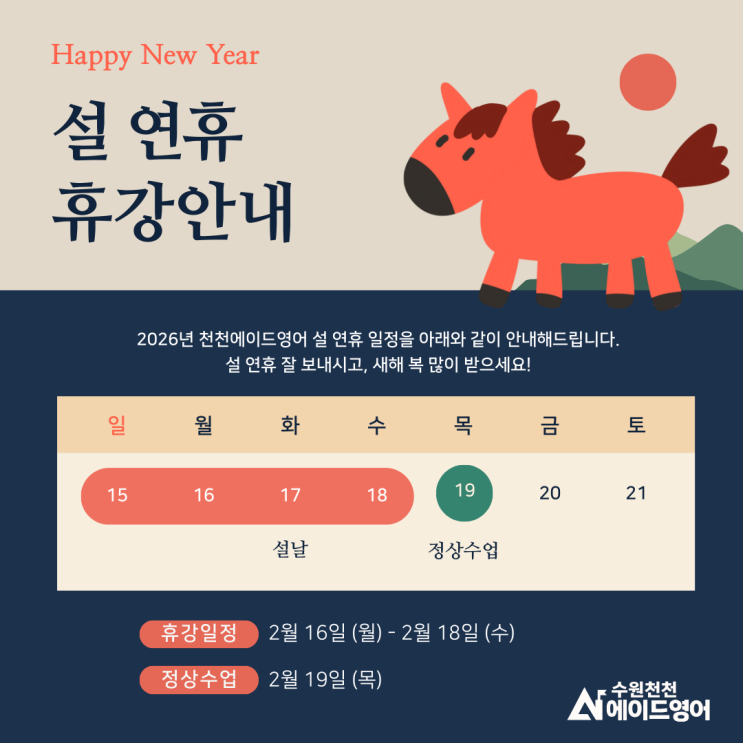 2026년 설 연휴 수업 일정 안내|천천에이드영어