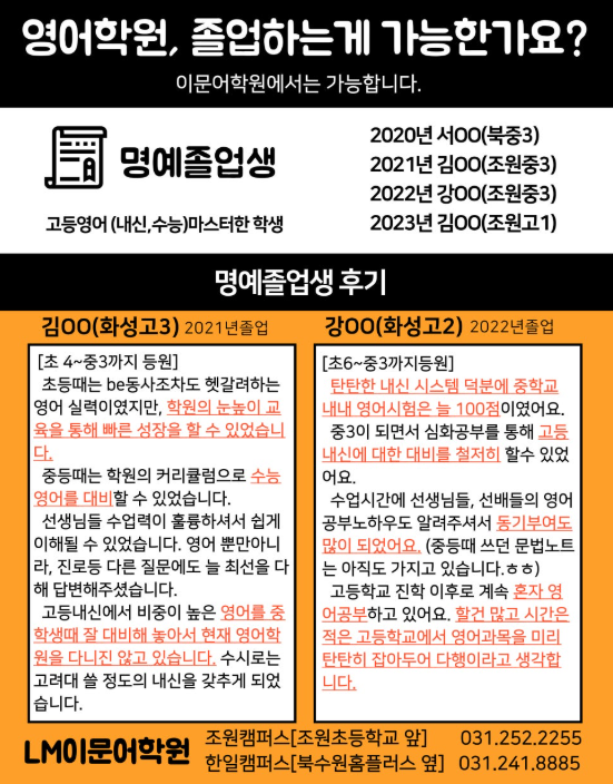 영어는 평생 공부해야 한다고 하죠? 저희 이문어 학원에서는 학생들의 영어학원 졸업을 권장합니다. 탄탄한 기본기부터 수능/고등영어 내신 대비까지 중학생들도 마스터 할 수 있습니다! 공부하느라 바쁜 와중에도 졸업생들이 후기를 써주었습니다 고등학생이 되면 영어 뿐만 아니라 수많은 과목들을 신경쓰며 내신 관리를 해야하는 학생들.. 공부할 것이 너무 많도다.... 중학생 때 미리 잘 대비해두어서 이제 혼자 영어공부 하고 있어요! 이런 이야기를 들으면 선생님으로써 한 없이 뿌듯하고 학생들이 너무 기특하기만 합니다 더 많은 졸업생들이 나올 수 있도록 더 최선을 다 해 가르치는 이문어학원이 되도록 하겠습니다. <img src="https://blogthumb.pstatic.net/MjAyNjAyMTJfODUg/MDAxNzcwODcwMDM4ODMx.MmgOjTYRbsldH7jOm0ZQMdSfojYKQOeyk_PJqfDZWWQg.Bjsi-R5Y7Ui8vMFnQSxDdX_jdFd7pMj8rFx6pu6pBbAg.PNG/image.png?type=s3" />