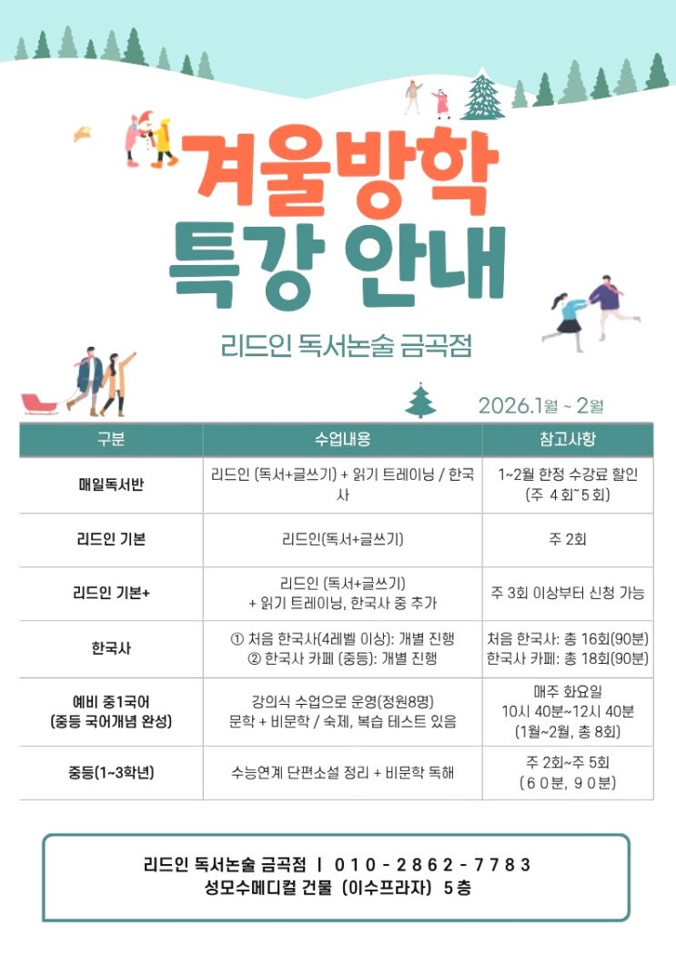 겨울방학 특강 안내드립니다 이번 특강은 평소 학기 중에 시간이 부족해 놓치기 쉬운 기초 독해력과 글쓰기, 한국사 등 아이들에게 꼭 필요한 필수 역량을 집중적으로 잡아주는 프로그램으로 구성했습니다. 1월 5일 개강 1. 매일 독서반 구성 : 독서 + 글쓰기 + 읽기 트레이닝 or 한국사(주 4회~5회) 학기 중 부족했던 독서시간을 확보하고 독해력과 글쓰기 기본기를 탄탄하게 다지는 수업입니다. 겨울방학 한정 수강료 할인 적용 2. 리드인 기본반 구성 : 리드인 기본 프로그램 (레벨별 독서 + 글쓰기) 리드인의 가장 기본 수업입니다. 부담 없이 리드인 수업을 시작해 보고 싶은 학생들에게 추천합니다. 수업 횟수: 주 2-5회 선택 3. 리드인 기....... <img src="https://blogthumb.pstatic.net/MjAyNTEyMDJfMTU0/MDAxNzY0NjczNTM2OTg1.-0Jz8z3N93M5IuIYCcf54A4R6RBguy2yg-xe7_2h_4Eg.-xRwK3Ih1kwW-BIEpM7Na5Ab9X2-HJaoFbiosELxASgg.JPEG/1764673536241.jpg?type=s3" />
