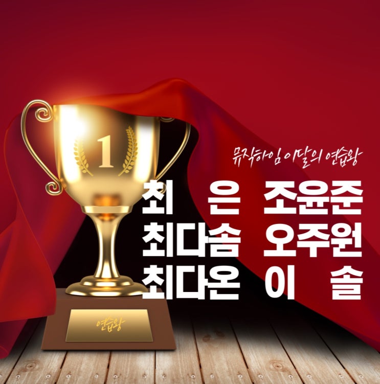 11월 이달의 연습 왕으로는 총 6명이 선발되었습니다! 앞으로 더 많은 친구들을 연습 왕으로 선발해서 응원하려고 해요 ♥ 작은 선물이지만 아이들도, 어머님들도 너무 좋아하시는 엄지 척 연습 왕! 아이들 의욕이 잠시 떨어졌다가도 다시 충만해지게 하는!! 바로 바로 연습왕 상입니다 :) 연습 왕이란? 열심히 연습하는 뮤직하임 친구들을 위한 보너스! 우리 뮤직하임 친구들의 좀 더 향상된 실력과, 동기부여 차원에서 신설된 상이죠! 매달 마지막 주, 연습 왕 친구들을 여러 명 선발하여 엄지 척! 트로피와 문화 상품권을 증정합니다 ♥ 11월 이달의 연습 왕 엄지 척 트로피! 열심히 연습해 준 이달의 뮤직하임 연습 왕 6명! 트로피가 여러 개....... <img src="https://blogthumb.pstatic.net/MjAyNTExMTNfMTc3/MDAxNzYzMDEwNTQ3OTE1.zSHjrj0Dx_tSj9ndsvKDin7SzXZb85X7i74aK-pwCawg.uuyKudiQXwAmu0LD8gIDGTzExyytAqMLUojjECTx3rQg.JPEG/KakaoTalk_20251113_140801938.jpg?type=s3" />