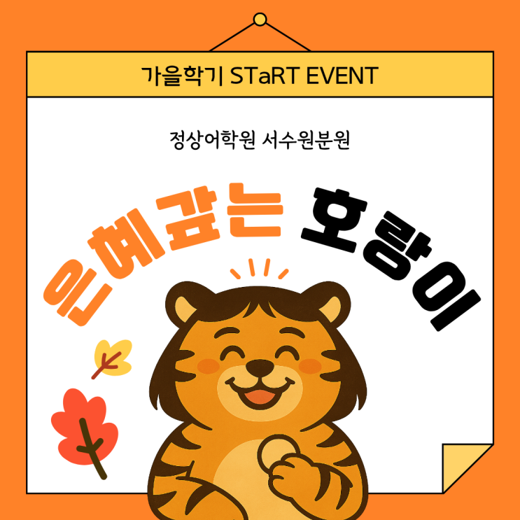 안녕하세요! 서수원 정상어학원입니다 가을 학기에는 ‘은혜갚는 호랑이’ 뽑기 이벤트가 진행되었어요! 매주 지정된 체크데이에 남은 재시험이 없는 모든 학생들에게 포인트를 지급하여 랜덤도구로 사탕 뽑기를 진행하는 이벤트로 일상에 소소한 재미를 더했답니다 성실하게 매주 시험을 통과해내는 학생들에게 조금이라도 더 재미를 주고자 서수원 정상어학원이 준비한 이벤트였는데요! 룰렛을 돌려 나온 도구로 제한시간 안에 마구마구 뽑기 !! 뽑은만큼 모두 가져갈 수 있어요 앗!! 하루에 너무 많이 먹지 말고, 양치 꼭 하기~~ CHESS, ACE 친구들 너나할 것 없이 모두 많이 참여했답니다 공부하느라 지쳤을 학생들을 위해 준비한 당충....... <img src="https://blogthumb.pstatic.net/MjAyNTExMzBfMjU3/MDAxNzY0NDM2MDc1Nzgw.S9i2W7uemLkHJOIky8dUS9FX3FJ98oBeyYOUW2ffWQsg.YXqC3ubvD4jNLLIhuo8VlunO310Fk0OmEfAy9u4JDfUg.PNG/KakaoTalk_20251130_020547434_03.png?type=s3" />