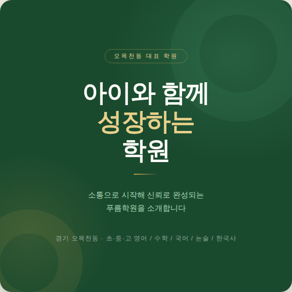 안녕하세요! 오목천동에서 초등·중등·고등 학생들을 지도하고 있는 푸름학원입니다. "우리 아이, 어떤 학원에 보내야 할까?" 학부모님이라면 누구나 한 번쯤 고민해보셨을 거예요. 문제집만 잔뜩 풀리는 학원인지, 아이가 실제로 이해하며 배우고 있는지, 선생님이 우리 아이를 얼마나 잘 알고 있는지 저희 푸름학원은 바로 그 고민에서 출발했습니다. 오늘은 푸름학원이 어떤 곳인지 어떤 마음으로 아이들을 지도하는지 자세히 소개해드릴게요. 푸름학원은 어떤 학원인가요? 푸름학원은 아이들과의 소통을 가장 중요하게 생각하는 학원입니다. 많은 학원들이 진도를 빠르게 나가고, 문제를 많이 풀리는 방식으로 운영됩니다. 물론 반....... <img src="https://blogthumb.pstatic.net/MjAyNjAzMDlfMjEg/MDAxNzczMDQ1MDQyMDE0.5T0LrvQqy2q-NfmFLQq1QeflWYYh4cQx8FW-5fq5mm4g.lzA5ecR4P4VBVBnAv_SL2SkgnQK5kJmH_uOi3jyQPpAg.PNG/%C7%AA%B8%A7%C7%D0%BF%F8_%C4%AB%B5%E5%B4%BA%BD%BA_1_%C7%A5%C1%F6.png?type=s3" />