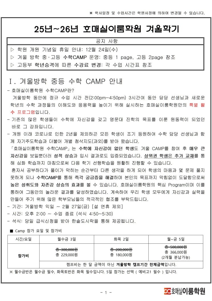 * 그림파일이 보기 불편하신 분은 그림파일 15page 아래로 내리시면 일반화면으로 보실 수 있습니다. 안녕하세요.^^* 호매실 이룸학원입니다. 25년~26년 호매실이룸학원 겨울학기 Ⅰ. 겨울방학 중등 수학 CAMP 안내 호매실이룸학원 수학CAMP란? 겨울방학 동안에 정규 수업 시간 전(2:00pm~4:50pm) 3시간여 동안 담당 선생님과 새로운 학년의 수학 과정들의 이해도와 응용력을 높이기 위해 실시하는 호매실이룸학원만의 특별 필수 프로그램입니다. 기존의 많은 학생들이 수학에 자신감을 갖고 명문대 진학의 목표를 이룬 원동력이 되었던 바로 그 강좌입니다. - 개원 이래 코로나로 인한 2년을 제외하곤 모든 학생이 조기 등원하여 수학 담당 선생....... <img src="https://blogthumb.pstatic.net/MjAyNTEyMDlfMTM3/MDAxNzY1Mjg0NDM0NzQw.yzn_dt36csCUkFNWhLpvj0tsj_0zWf_Lb9713bdb-A8g.wmWf8Lb6CvWpQEDPtolURPpZHGv-rTmO1HXt1btpXUog.JPEG/2526%B0%DC%BF%EF%BE%C8%B3%BB%B9%AE%282425%B3%E2%B0%DC%BF%EF%BE%C8%B3%BB%B9%AE%2B25%BF%A9%B8%A7%BE%C8%B3%BB%B9%AEbase%29wide_ver1.2001.jpg?type=s3" />