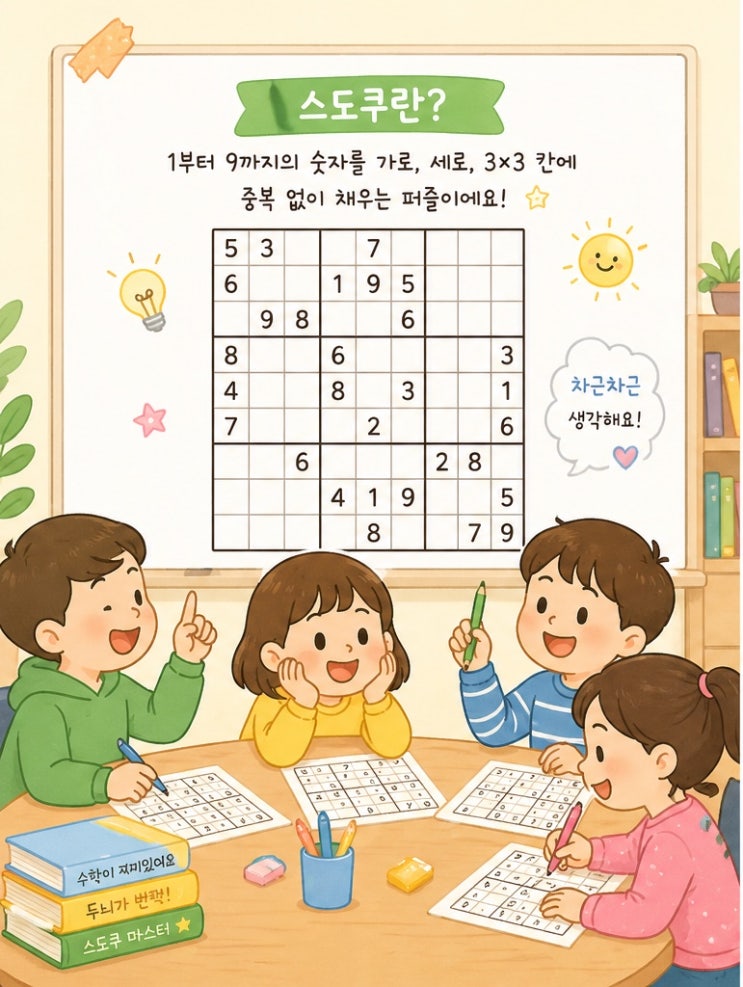 안녕하세요, 아담리즈 수원 권선센터 입니다! 피타고라스 사고력 수업시간 중 "스도쿠"를 주제로 수업하는 시간을 탐방해 볼게요 ◆ 스도쿠는 대표적인 수학 두뇌 게임인데요~ 주어진 규칙을 준수하여 가로/세로 맞추어 보는 퍼즐 게임 입니다. 숫자 뿐 아니라 도형, 글자, 체인 스도쿠 등 다양한 유형의 스도쿠를 수업시간에 학습해 봅니다. 딱딱하고 어려워 보이는 스도쿠를 쉬운 유형부터 심화 유형까지 선생님과 다루어 보며 두뇌를 빠르게 회전시켜 봅니다^^ 제한된 시간 안에 스도쿠를 완성하면 성취감도 느끼며 규칙을 토대로 스도쿠를 맞춰보며 예측하는 힘도 길러볼 수 있습니다:) 우리 친구들도 핸드폰 게임, 컴퓨터 게임 뿐....... <img src="https://blogthumb.pstatic.net/MjAyNjA0MjhfMTQg/MDAxNzc3Mzc3NzgyODU4.D17orK4NPFHMelvloeIafvOsniif2hn5dbEKLDhCvxcg.ngL4txPlWx1lCrj_Jt3nmEoZHql-APsD183omw8u0FUg.JPEG/KakaoTalk_20260428_205037936.jpg?type=s3" />
