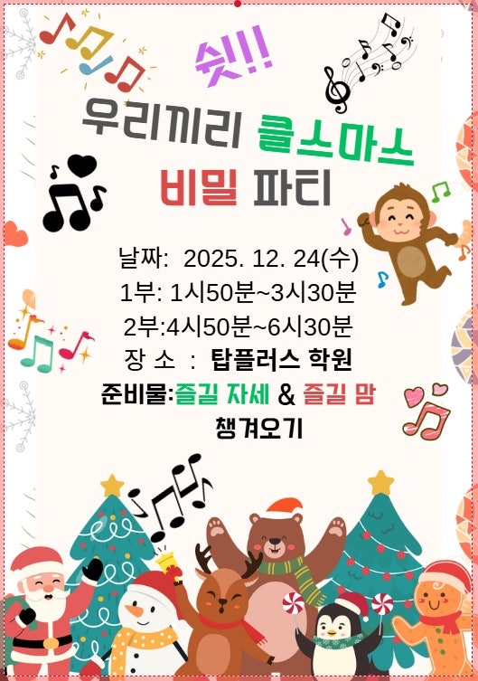 메리 크리스마스~~^^ <Chrismas Party~~~> 준비물: 즐길 자세& 즐길 맘 챙겨오기!! 우왕~~ ♥♥♥ 모두들 완벽하게 잘 챙겨왔넹~^^ 그럼 클스마스 비밀 파티 Start~♬♪♬♪♬♪ 1.폴짝! 폴짝 가위,바위,보 2.주사위로 일심동체! 3.계란판에 탁구공 골인!! 4.무게 측정은 내가 신의 손! 5.추억의 뽑기 ! 제일 두근 두근 거리는 순간~♥ 6.어떤걸 선택해야 맘에 들까? (선물 선택 시간~) 7. 맛난 어묵 먹기~ 8.우리들만의 추억들~ 쌤은 오늘 매번 게임에 져서 실망하고 있는 동생들을 위해 뽑기 기회를 양보해주는 6학년들의 배려심! 착한 마음을 보게 되어 감동이었구. 학원이 이렇게 행복한 곳인지 처음 알았다는 탑플 친구의 말 한마....... <img src="https://blogthumb.pstatic.net/MjAyNTEyMjRfMjk0/MDAxNzY2NTc5MDIwNDM2.iBVpqawrYpPf67R7YzfG0E8AzfKX_S9EzKqqpOTRTuAg.F6rmgACMlHfznxMoinXQi0xKhlyxhO6YBLrFCQ46Qp0g.JPEG/%C5%AC%BD%BA%B8%B6%BD%BA_%C6%C4%C6%BC.jpg?type=s3" />