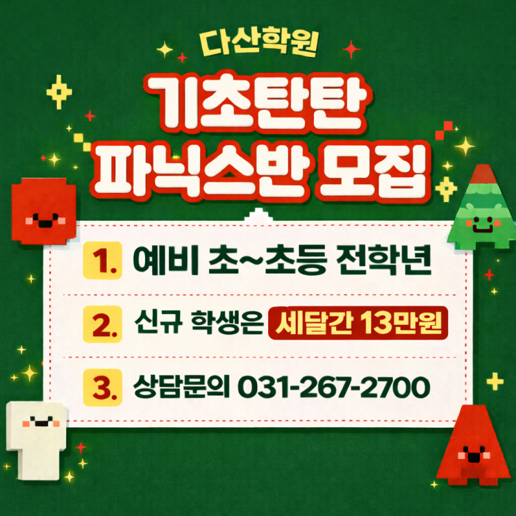 안녕하세요! 파머스영어 산돌수학학원입니다. :D 어느덧 희망찬 2026년 새해가 밝았습니다. 지난 2025년, 우리 아이들과 함께 숨 가쁘게 달려오며 보람찬 순간도 많았지만 한편으론 조금 더 해주고 싶었던 아쉬움도 남습니다. 올해는 그 아쉬움까지 모두 채워, ''작년보다 더 나은 오늘"을 만드는 파머스영어 산돌수학학원이 되겠습니다. 우리 재원생들의 실력 향상과 성장을 위해 더욱 양질의 교육 서비스를 제공할 것을 약속드립니다! 제1회 Parrot Reading 이벤트 수상자 발표! 지난달, 우리 아이들의 영어 자신감을 쑥쑥 키워주었던 [Parrot Reading 이벤트]가 있었죠? 원어민의 발음과 억양을 그대로 따라 하며 영어의....... <img src="https://phinf.pstatic.net/image.nmv/blog_2026_01_02_980/nggAfbRfaV_01.jpg?type=f480x480" />