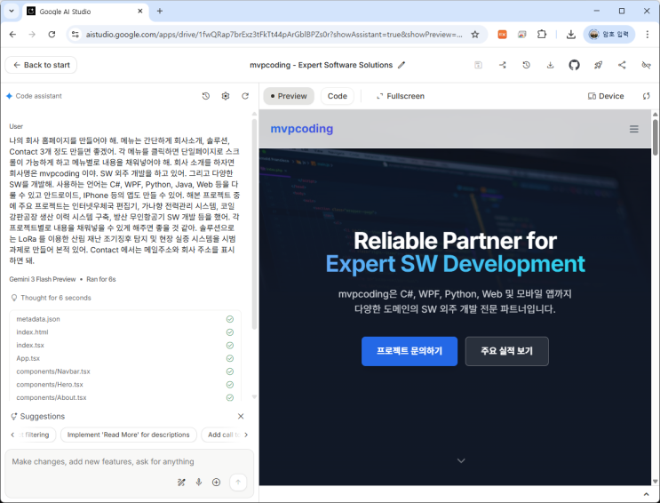 예전에는 웹사이트 하나 만들려면 홈페이지 제작 업체에 50만원정도라도 주고 만들어야 했지만 이제는 인공지능 AI 시대. 누구나 자신만의 또는 기업 홈페이지를 무료로 그것도 하루만에 만들 수 있습니다. 물론 상세 표시 사항들을 수정하고 이미지 작업하는 데 며칠 시간이 더 걸리겠지만 중요한 건 이제는 무료로 언제 어디서든 만들 수 있다는 데 아무도 의심하지 않습니다. 회사 홈페이지 하나 만들어보죠. gemini ai studio 에서 자신만의 홈페이지 구성을 프롬프트에 작성합니다. 한번의 프롬프트로 5분정도면 홈페이지하나가 만들어집니다. 배포하기 여기서 멈추면 안되겠죠? 홈페이지를 제가 가지고 있는 Synology NAS 에 업로드해서 mv....... <img src="https://blogthumb.pstatic.net/MjAyNjAxMDNfNCAg/MDAxNzY3NDIxMjkwNTEz.e0j_mJ5KHOe5lZJyUK50dyjn291LhiplSY9R_ROflPgg.jSh-bQ22iY11zXN_Pm2jh5y0KOnoMSRsTrOC6BMRPyog.PNG/image.png?type=s3" />