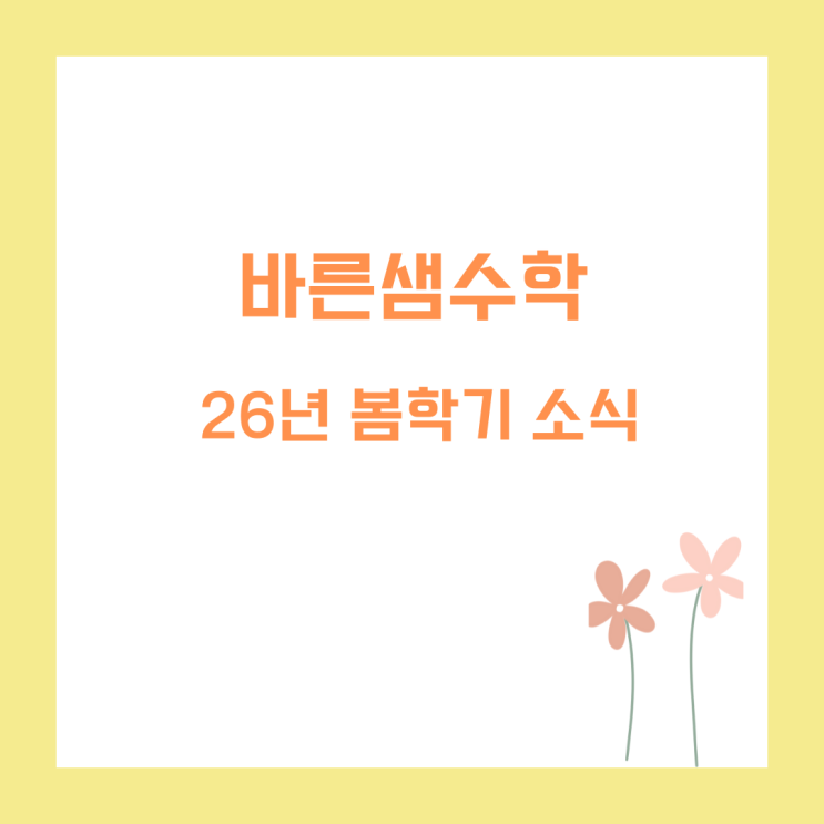 권선동 수학전문 바른샘수학, 봄학기 소식 전합니다. 1. 설 과제 이벤트 수상자 발표 바른샘수학 시그니처^^ 긴 명절동안 즐기는 수학 과제! 수상자 친구들에게 싱글콘 발송했습니다. 2. 2시 신규반 오픈 안내 월~목 2시 class 오픈합니다. 매일 연산 15분이 포함되어 있는 수업으로 주2회 또는 주4회 선택가능합니다. 실력에 따라 연산은 기적의 계산법 또는 상위권연산 960, 교과는 디딤돌 원리~기본응용 교재로 공부합니다. 3. 봄 학기(3-5월) 수업 일정 안내 대체휴일 정상 수업 : 3월 2일 / 5월 25일 휴강일 : 5월 5일 상담문의 : 010 7392 5303 #수원수학전문 #권선동수학학원 #아이파크시티수학 #곡정초수학학원 #남수원중수학학원 #화홍....... <img src="https://blogthumb.pstatic.net/MjAyNjAyMThfMTk0/MDAxNzcxNDE2ODk0OTE4.TC-Yg3fFgnIci6cFc7fbmgti6PEltBSfcJbYyO-p78Ug.GtSiX9vNJHZqaxWgPpUCvLQcBseWUYrk_MPzUoTZ2cMg.PNG/%B4%A9%C0%FB%BF%AC%BB%EA%C7%D0%BD%C0%C1%F6.png?type=s3" />