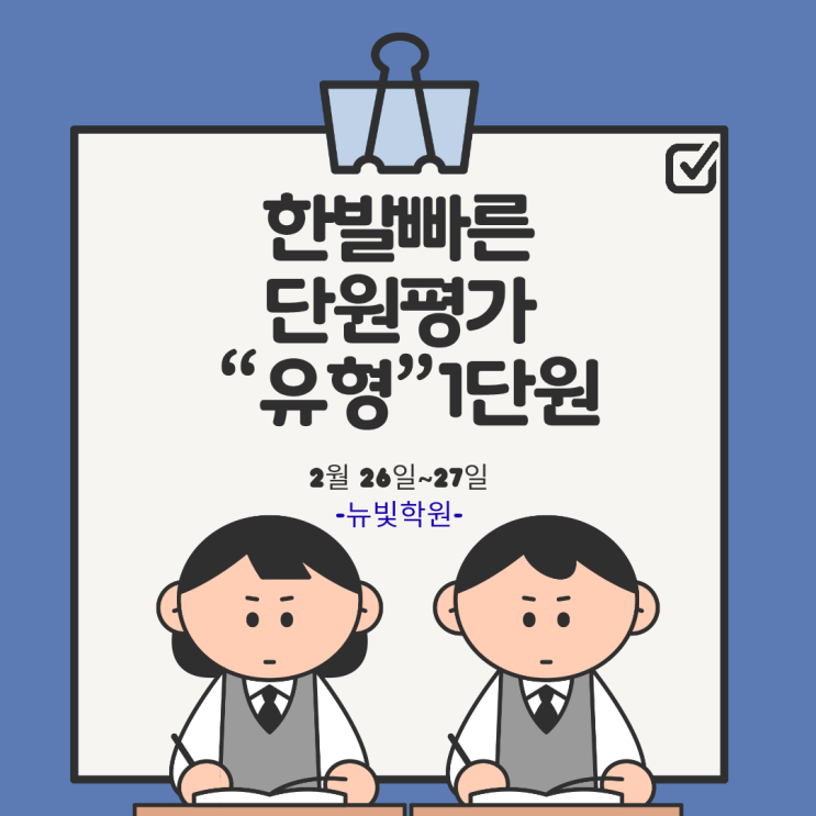 안녕하세요, 뉴빛학원입니다 한발빠른 단원평가 "유형" 1단원 시험을 아래와 같이 진행합니다. 일정 : 2월 26일(수) ~ 27일(목) *시험 후 부족한 부분은 꼼꼼히 보충합니다* 문의: 031-233-1935 <img src="https://blogthumb.pstatic.net/MjAyNjAyMjJfMjI5/MDAxNzcxNzY3MzI0NzAw.wgjRgjYTe_xhNhR-btpuVZmHRvKOyPY7hcIZ9U-odc8g.TvYonZsDE4CtCrl1yfhi9L8I65X0klXLg8zy6n0ghFQg.PNG/a_8e7Ud018svc1gi232dcm418n_e4t5yg.png?type=s3" />