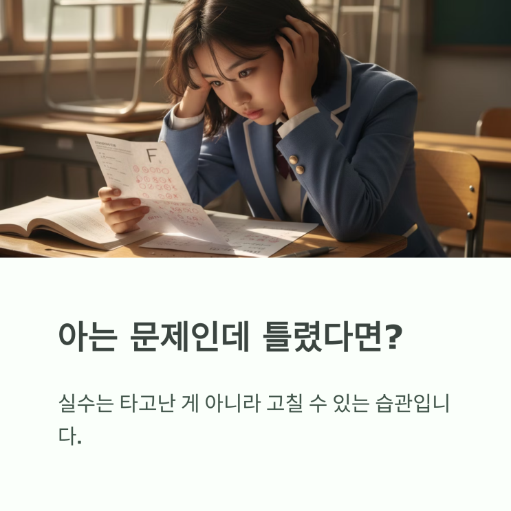 "아, 맞다! 이거 아는 건데..." 더 이상 후회하지 말자! ♂️ 시험지를 돌려받는 날, 심장이 쿵쾅거리는 그 느낌 RGRG? 떨리는 손으로 시험지를 딱 펼쳤는데... 분명히 아는 문제인데, 어이없는 계산 실수로 틀려버린 그 순간! 진짜 머릿속이 하해지고 너무너무 속상하잖아. "엄마, 나 이거 아는 거야..."라고 아무리 말해도 이미 떠나간 점수는 돌아오지 않지. 그런데 얘들아, 실수는 타고난 게 아니라 '습관'의 문제라는 거 알아? 나쁜 습관만 고치면 10점, 아니 20점도 바로 올릴 수 있어! 우리 형설학원에서 공부하는 친구들도 처음엔 다 그랬어. 하지만 쌤이랑 같이 이 '검산법'....... <img src="https://blogthumb.pstatic.net/MjAyNTExMjFfNzQg/MDAxNzYzNjU4NzAxOTEz.9pZ7TajNsOhgNj8X3jQcadw5NTdCzPhW4lVkvTaKi8Mg.oRhYH2xMjuTPJnNAKX2O_yd495sc_N4pJIC45G8pn0Ag.PNG/1_.png?type=s3" />