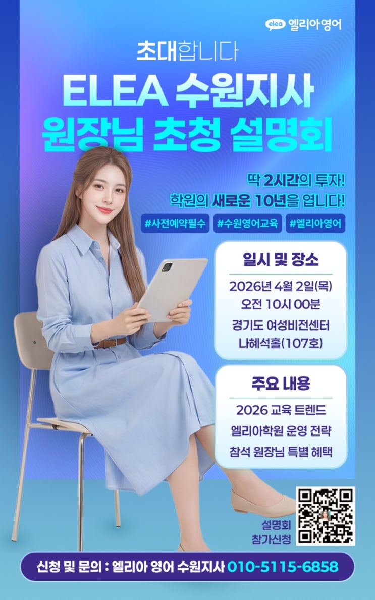 안녕하세요. 엘리아영어 수원지사장입니다. 영어학원을 운영하시는 원장님들, 평소 영어교육을 하시면서 원어민 강사채용에 따른 '비용'과'시간'문제로 고민해 본 적 있으신가요? 이러한 학원장님들의 오랜 고민을 완벽하게 해결해 줄 혁신적인 영어학습 브랜드, 엘리아(ELEA)가 드디어 수원에 상륙합니다.! 수원 지역 원장님들을 모시고 그 놀라운 교육 시스템을 공개하는 "엘리아영어 수원 사업설명회"를 개최합니다. 왜? 엘리아영어"에 주목해야 할까요? ▶원어민 강사 스트레스 끝!!! AI 디지털 휴먼 선생님 엘리아는 생생한 표정과 움직임으로 실제 원어민 처럼 소통하는 AI디지털 휴먼 선생님을 제공합....... <img src="https://blogthumb.pstatic.net/MjAyNjAzMjNfMTUg/MDAxNzc0MjUwMTQyNzYw.c_AE9ap260Clcevwn2VB0cYrhICBWcjcjy4sOClyAGkg.K-aMmK4PnBXs9EoYcqvzbhUaDIDR7UM9CBxRwdKut7Ag.JPEG/%BF%A4%B8%AE%BE%C6%C5%A5%BE%CB%C3%CA%C3%BB.jpg?type=s3" />