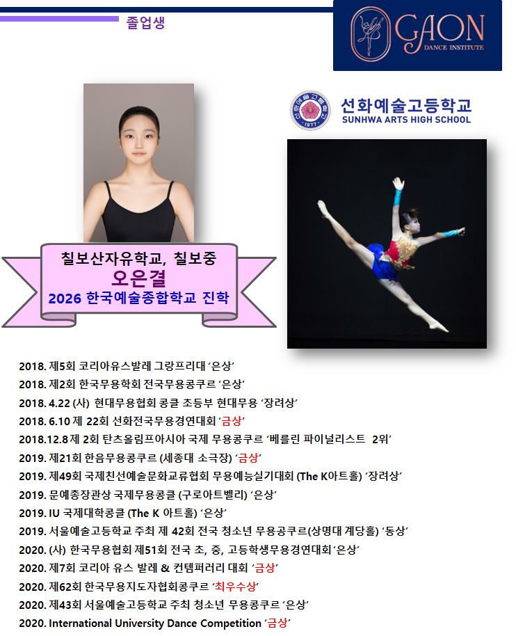 가온무용학원은 학생 개개인의 목표와 진로에 맞춘 맞춤형 지도와 체계적인 훈련을 통해, 다수의 졸업생이 진학·입시·콩쿠르 등 다양한 분야에서 성과를 이룰 수 있도록 지도하고 있습니다. 가온에서 함께했던 시간 속에서 졸업생들은 꾸준한 훈련과 무대 경험을 바탕으로 의미 있는 성과를 만들어냈습니다. 앞으로도 가온은 학생들의 가능성이 실제 결과로 이어질 수 있도록 끝까지 함께 지도하겠습니다. 아래는 가온무용학원 재원 당시 학생들이 쌓아온 주요 이력입니다. 오은결: 선화예술고등학교 진학 2026 한국예술종합학교 진학 이서현: 충남예술고등학교 진학 2026 한양대학교 진학 박서현: 선화예술고등학교 전체수석 실....... <img src="https://blogthumb.pstatic.net/MjAyNjAxMTJfOTMg/MDAxNzY4MjAxOTIwODE5.uFoNa-YRaZa288UhfxCjbBJK1XYMkYRadFBptBV9eSEg.jFcuvCnQYsv_yje2_Ncxm0BW3IY5k-UXbqOxe0vkonog.PNG/%BF%C0%C0%BA%B0%E1.png?type=s3" />