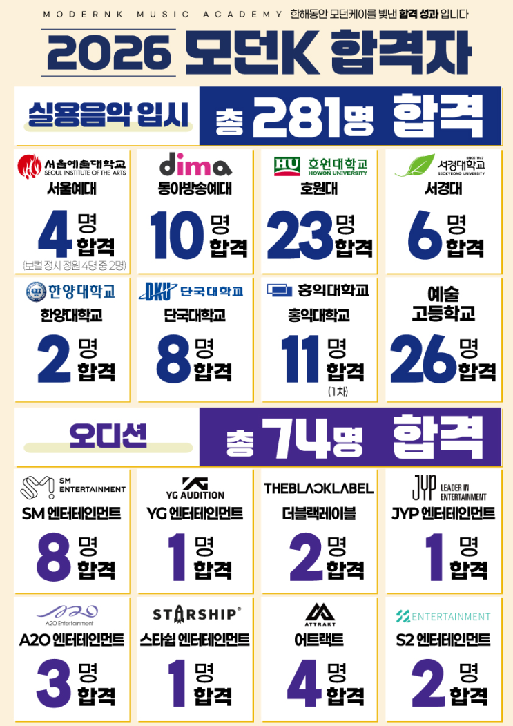 입시와 오디션 모두 최고의 결과를 만들어내는 아카데미는 모던K가 국내 유일합니다 2026학년도 입시 서울예대 4명 (보컬 정시 정원 4명 중 2명), 동아방송대 10명, 호원대 23명, 서경대 6명, 예술고등학교 26명 등 총 281명 최종합격 2025년 오디션 SM 8명, YG 1명, 더블랙레이블 2명, JYP 1명, A2O 3명, 스타쉽 1명, 어트랙트 4명, S2 2명 등 총 74명 최종합격 2025년 데뷔 우리들의 발라드 임지성, 스틸하트클럽 김건우 박형빈 정은찬, 힙팝프린세스 최가윤, 프로젝트7 전민욱 (CLOSE YOUR EYES), 유니버스리그 박한 (AHOF), 리센느 LIV 모던K 라인 마마무 (전원), 비투비 서은광, 이창섭, 임현식, 스트레이키즈 창빈, 엑소 첸, 에이핑크 윤보....... <img src="https://blogthumb.pstatic.net/MjAyNjA0MDhfMTEx/MDAxNzc1NjI5OTkxMzAw.Xub3FGdthiXdNVUDcWh8MbM55q1UE4jqW0ouyzQM3JIg.H4wb0EchtLRa6mDzKHbLhxrYopszHly9uKPtuTHTBmwg.PNG/image.png?type=s3" />