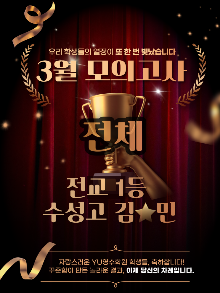 안녕하세요, YU영수학원입니다, 저희 학원에 정말 기쁘고 가슴 벅찬 소식이 전해져 자랑을 안 할 수가 없네요 우리 학원 성실의 아이콘 김☆민 학생이 26년 3월 모의고사에서 수성고 전교 1등이라는 쾌거를 이뤄냈는데요! 한 과목이 아닌 전체 1등을 차지했습니다! 영수 학원인데 어떻게 전 과목 성적까지 오르나요? 많은 분들이 물으십니다. "수학은 사고의 근육을 기르는 학문입니다." 저희 YU영수학원은 단순히 문제 풀이를 가르치는 데 그치지 않습니다. ✔ 자기주도적 학습 : 스스로 문제를 분석하고 끝까지 해결하는 인내심을 기릅니다. ✔ 논리적 사고력 확장 : 수학적 사고가 잡히면 타 과목의 지문을 해석하고 구조화하는 능....... <img src="https://blogthumb.pstatic.net/MjAyNjA0MTZfMjgx/MDAxNzc2MzM1Nzg2NjE2.bKy29TFTfLfFmrdNEkIhHz7x12TGhk6go7BjdavDg5Ug.khDk5wWaFJCCZWHmbKubRgCVZBlciaDiX0RLga8-Bu4g.PNG/%C1%A6%B8%F1%C0%BB_%C0%D4%B7%C2%C7%D8%C1%D6%BC%BC%BF%E4..png?type=s3" />