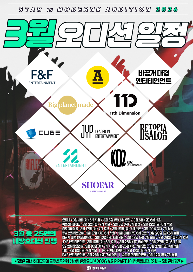 안녕하세요 모던K 실용음악학원입니다! 3월 모던K 실용음악학원 오디션 소식 안내드립니다 JYP, KOZ, 안테나, 큐브, S2, 빅플래닛메이드 등 3월 한달간 총 25번의 내방오디션 진행됩니다 외부 학생 지원이 가능한 오디션들이니 관심 있으신 학생분들께서는 각 오디션이 진행되는 캠퍼스 인스타그램 프로필 링크를 통해 신청해 주시길 바랍니다 :) 모던K 수강생들은 각 캠퍼스 사무실에서 지원 바랍니다! 1. 안테나 X 빅플래닛메이드 오디션✨ 일시 : 2026년 3월 3일 (화) 6시 (안테나), 7시 (빅플래닛메이드) 장소 및 신청 : 모던K 수원캠퍼스 (@modernk_suwon) 2. 안테나 X 빅플래닛메이드 오디션✨ 일시 : 3월 5일 (목) 6시 (안테....... <img src="https://blogthumb.pstatic.net/MjAyNjAyMjRfMjcg/MDAxNzcxOTEwNDIzOTA1.UDFz5aT-2hn9j-etdnXaNdeoguBFjNEaIjfl1zn3wK4g.NWfaEdCGZZ7IEjkkdrMgrZIKtu70FU-pBwFVvUQbiakg.PNG/image.png?type=s3" />