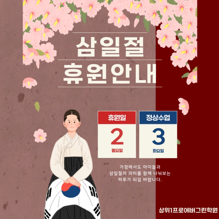 상위1프로에버그린학원<삼일절 연휴 휴원 공지>