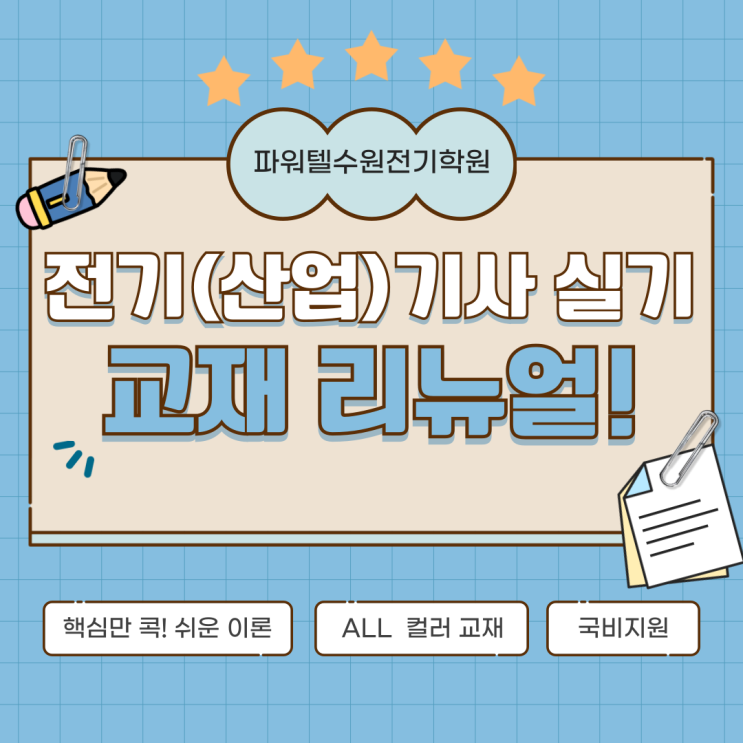 안녕하세요! 파워텔 수원전기학원입니다. 오랜만에 인사드립니다. 지난 명절 잘 보내셨나요? 저희 파워텔 수원전기학원에서는 전기기사 필기, 전기산업기사 필기 수강생 분들께서 많이 합격하여 명절때 보다 더!!!! 마음이 풍요롭습니다.ㅎㅎ 이제 2026년도 제 1회 전기(산업)기사 필기 시험도 3일밖에 남지 않았는데요, 남은기간 시험을 치룰 수험생 여러분들! 모두 응원합니다. 본론으로 돌아와서! 지난번의 전기(산업)기사 필기 교재 리뉴얼에 이어 이번에는!!! 전기(산업)기사 실기 정규반 교재를 리뉴얼 했습니다. 전기기사 실기, 전기산업기사 실기 시험에 자주 출제되는 핵심 유형들로만 모으고 모아서 만든! 파워텔 수원전기학원만의 자....... <img src="https://blogthumb.pstatic.net/MjAyNjAyMjZfNTgg/MDAxNzcyMTAwODA0MzYy.rtqRCoavQzx_lyk3VXRySw38t4e-HkMZXvHRCadCYbMg.E3Uu38vGOR8kaJtxwKdH6SfxIvcb4SYAUOAKlX3pL5Eg.PNG/%C1%A6%B8%F1%C0%BB-%C0%D4%B7%C2%C7%D8%C1%D6%BC%BC%BF%E4_-003.png?type=s3" />