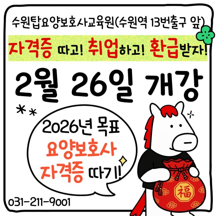 "요양보호사 자격증, 나도 도전해볼 수 있을까?" 가족요양, 방문요양, 요양원, 주간보호센터 요양보호사 자격증으로 안정적인 진로준비 취업까지 한 번에 알아보고 싶으신 분들 모두 환영합니다! 안녕하세요. 수원탑요양보호사교육원입니다 26년 2월 26일 목요일 국비지원 받고 자격증 취득하고 취업하고 전액 환급받기 내일배움카드 국비지원이 되나요? 네! 내일배움카드 사용가능 국비지원이 되는 요양보호사교육원입니다. 요양보호사 교육 자부담 90%, 국비지원 10% (수료 후 6개월 이내 취업 후, 6개월 이상 고용유지 시 자부담 100% 환급) +) 나는 구직자에요! 훈련장려금까지 받기 가능! (월 최대 116,000원 / 약 2개월 ....... <img src="https://blogthumb.pstatic.net/MjAyNjAyMTlfMTc4/MDAxNzcxNDc4NDk3MDQz.1GHz6i2oiFL2zZh4jok_MzpU7JOmcE0rXNHw963jMYUg.8KG5KLde8rWdDX4SOq5SxqjlakMldDA-Zd8kZTCvCJQg.JPEG/%C1%A6%B8%F1%C0%BB_%C0%D4%B7%C2%C7%D8%C1%D6%BC%BC%BF%E4._%2840%29.jpg?type=s3" />