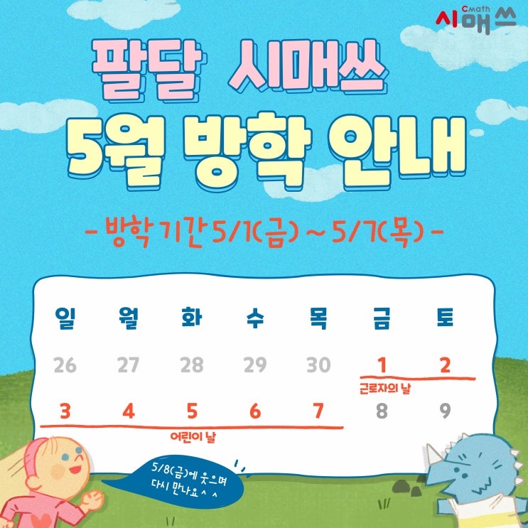 Always green~!! 색색깔의 봄꽃과 초록의 향연이 느껴지는 완연한 봄입니다. 인계동 초등영어학원 상위1프로 에버그린학원은 요즘 다가오는 마켓데이 준비로 한창이랍니다~~ 5월은 마켓데이부터 가정의 달 행사까지 유난히 분주하지만 우리 그린이들은 너무나 열심히 영어공부를 하고 있어서 얼마나 대견한지요~^^ 5월 수업일정 안내드립니다. 상위 1프로 에버그린학원 5월 수업일정 5월 1일~ 6월 1일 병결, 여행, 개인사정 등으로 피치 못하게 결석하게 될 경우 보충수업을 진행합니다. (당일결석 제외 / 월2회 한정) 5월 1일에는 2년만에 마켓데이가 다시 열립니다. 어린이날 행사와 함께 진행하는 이번 마켓데이에 그린이들의 기대감이 가득하....... <img src="https://blogthumb.pstatic.net/MjAyNjA0MTZfNTkg/MDAxNzc2MzQ1NTI3NDAx.Fe3fGIekGTB7UJmC_NuLfkKktC_KDxZ5BvnL7w1jJ3og.FWTbIPRDGjU99znNE4o460mojZjDM1v_xWbGOYa86ysg.JPEG/%BC%F6%BE%F7%C0%CF%C1%A4-%BD%E6%B3%D7%C0%CF-001_%282%29.jpg?type=s3" />