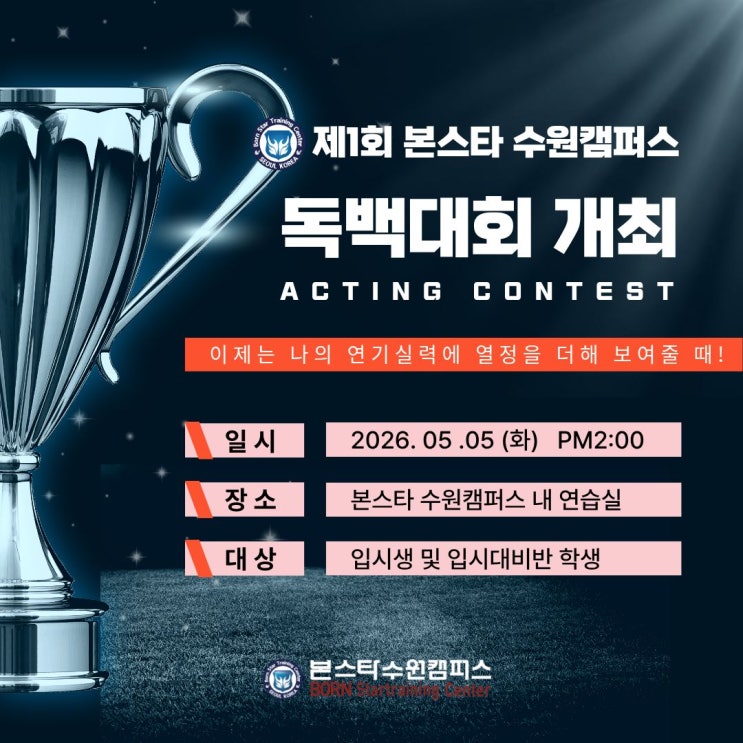 안녕하세요~^^ 본스타수원캠퍼스입니당 오랜만에 따끈따끈한 소식을 들고 왔답니다 ^---^ 바로바로 우리 수원캠퍼스에서 제 1회 독백대회를 개최한다는 사실인데요 ^ ^ 이번에는 참석 가능하신 부모님들도 함께 초대해서 자녀들이 잘 하고 있는 모습들을 볼 수 있는 아주 좋은 기회가 될 꺼 같은데요^^ 이번 독백대회에서는 특별히 1등부터 3등을 한 학생들에게는 소정의 장학금이나 상품이 주어진다는 사실도 잊으시면 안되요^^ 호호호 제 1회 독백대회이니 만큼 다들 열심히 잘 준비해서 좋은 결과 있기를 바랄께요^^ 뽜이팅!!!1 문의 : 031-211-3004 카톡문의 : 본스타수원캠퍼스 홈페이지 : http://sw.bornstar.co.kr/ 주소 : 수원시 팔달구....... <img src="https://blogthumb.pstatic.net/MjAyNjA0MTVfNzcg/MDAxNzc2MjI5OTE2MDM2.V1UlaBOtG1Ojf8j9cpTLHXcMRoZDUQZLnGQHYqrcv0gg.E7YvhTLMM2u8jT9YSmAjUk1FINRyLWqlHQj6SgcXxLQg.JPEG/KakaoTalk_20260414_163054099_02.jpg?type=s3" />