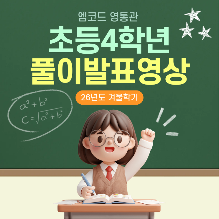 초등 4학년 문제풀이 발표 영상 엠코드 영통관에서는 아이들이 문제를 풀고 끝나는 것이 아니라, 풀이 과정을 스스로 정리해 말로 설명하는 연습도 함께 하고 있습니다. 이번 겨울학기에는 초등 4학년 아이들의 문제풀이 발표 모습을 영상으로 담았습니다. 칠판 앞에서 자신의 생각을 차분히 설명하는 모습이 참 대견하게 느껴졌어요 수업 현장 GIF ① 수업 현장 GIF ② 수업 현장 GIF ③ 각 아이의 전체 발표 영상은 학부모님들께 유튜브 링크로 개별 전달드렸습니다. 문자로 받으신 링크를 통해 우리 아이의 발표 모습도 확인해보세요 아이들이 성장해가는 과정들을 앞으로도 조금씩 나누어 드리겠습니다 ▼....... <img src="https://blogthumb.pstatic.net/MjAyNjAyMjRfMjM4/MDAxNzcxOTEwNjc0NTc3.AajDLPzHe5fMauEPcj0ONDT-aLBktKBUId6PpTsB4SAg.Lc5-fXiB7xb9XgeydaG6_SKvfArp5nqZJfjZPql6FwUg.PNG/%C1%A6%B8%F1%C0%BB_%C0%D4%B7%C2%C7%D8%C1%D6%BC%BC%BF%E4._%288%29.png?type=s3" />