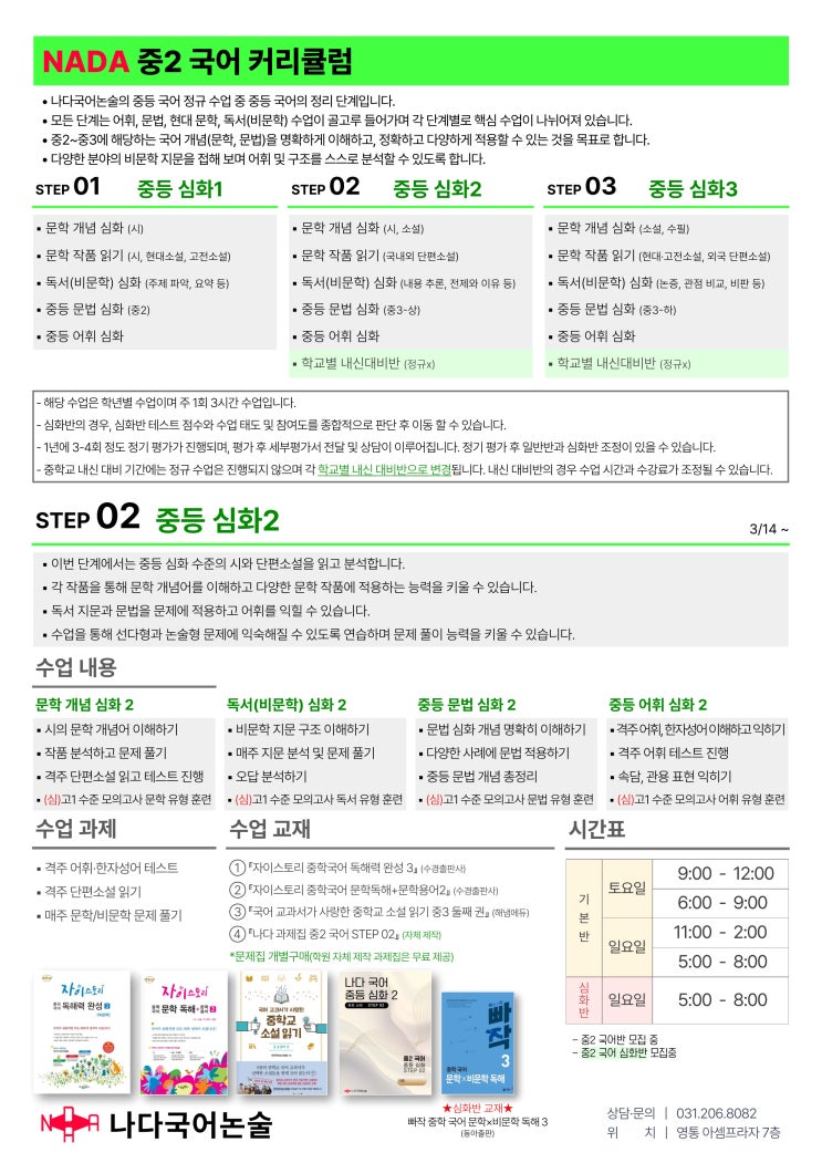 2026년 새로 개편된 나다국어논술학원 중등 국어 커리큘럼! 2026년 중등 국어반 학생들과 학부모님들의 수요를 반영하여 중등 국어를 " 중등 기본(중1) - 중등 심화(중2) - 예비 고등(중3)" 학년별 단계로 구성하고 중2 국어는 3 STEP으로 분류하여 더욱 체계적인 국어 수업으로 진행됩니다! 더욱 자세한 내용은 학원으로 문의주시기 바랍니다. 상담 031.206.8082 **중2 국어- 중등 심화2 3/14(토)부터 시작됩니다.** #나다국어 #나다독서 #나다논술 #나다국어논술학원 #초중등 #독서토론 #논술 #커리큘럼 #수능국어 #내신국어 #내신대비 #중등문법 #수원국어학원 #영통국어학원 #영통국어 #중등국어 <img src="https://blogthumb.pstatic.net/MjAyNjAzMDFfMTIx/MDAxNzcyMzU1OTYxNDI2.fTqXC-f1zGx_htUamHUIvwApFjrP74DYvi3K1eKnjy4g.iPxCGu0oeTAIcP9w6qq7mRq8_taFvwpEgj3ZoiuA5jYg.JPEG/2026%B3%E2_%B3%AA%B4%D9_%C1%DF%B5%EE_%B1%B9%BE%EE_%C4%BF%B8%AE%C5%A7%B7%B3-002.jpg?type=s3" />