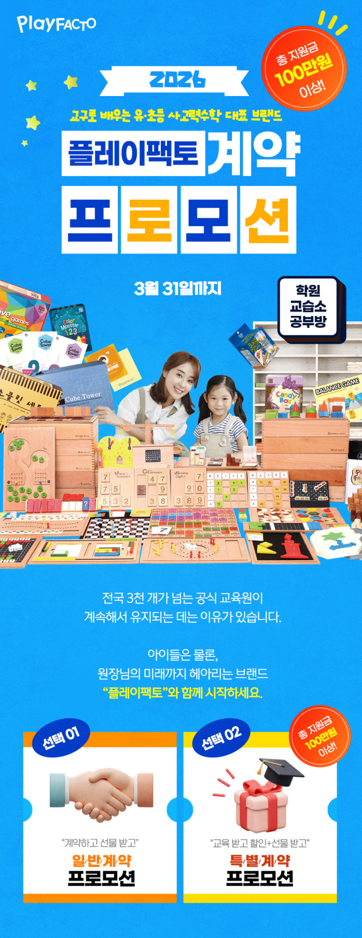 2026년, 수원에서 유·초등 수학 공부방 창업을 고민 중이신가요? 유·초등 공부방, 교습소, 학원 창업을 준비하시거나 기존 교육원에 수학 프로그램 도입을 고민 중이신 원장님께 좋은 소식을 전해드립니다. 처음 시작은 누구에게나 고민이 됩니다. ✔ 아이들이 잘 올까? ✔ 투자금이 부담되지는 않을까? ✔ 운영은 내가 잘 해낼 수 있을까? 해야 하는 이유는 분명한데, 망설이게 되는 이유는 자꾸 늘어나지요. 하지만, ✔ 초기 부담을 줄이고 ✔ 위약금 걱정 없이 ✔ 월 고정 수수료 없이 ✔ 교구와 교재는 필요할 때만 주문하는 구조라면? 조금 더 가볍게 시작해볼 수 있지 않을까요? 플레이팩토 수원지사 010- 4468- 8570 2026 창업 지원....... <img src="https://blogthumb.pstatic.net/MjAyNjAzMDNfMTA4/MDAxNzcyNTE4NjAzODE1.WCzKXcV8MpF2gGWt9fndHE6OL7-EOfRM2qWgrVCAF90g.LO1TAJM6s2tuBT9bgBccr8zSo_G4RzLeohcelfjTv84g.PNG/1.png?type=s3" />