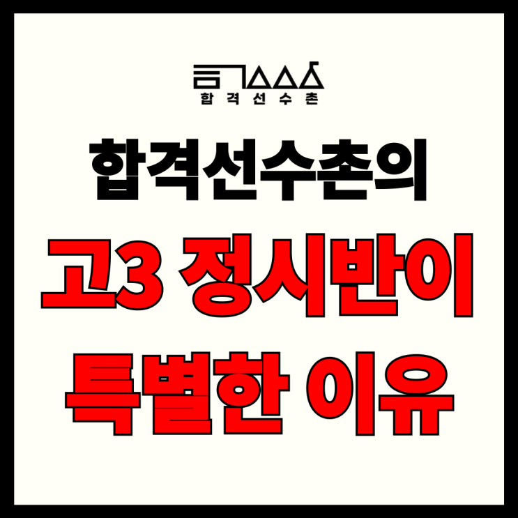안녕하세요, 합격선수촌학원입니다. 2026 합격선수촌 고3 정시반을 개강합니다. 합격선수촌학원의 고3 정시반은 단순히 강사의 수업만 듣고 끝나는 곳이 아닙니다. 학생 한 명 한 명의 공부 흐름을 점검하고 실제 성적 상승으로 이어질 수 있도록 끝까지 책임지는 '관리형 정시반'입니다. 그래서 우리 학원은 학생들이 시기별로 필요한 공부를 놓치지 않도록 정시 흐름에 맞춘 빈틈없는 커리큘럼을 준비했습니다. 오늘 포스팅에서는 합격선수촌학원 고3 정시반의 시간표와 함께, 우리 학원만이 가진 특별한 강점에 대해 전해드리겠습니다. 본격적인 학원 시스템 소개에 앞서, 가장 기본이 되는 시간표부터 안내해드리겠습니다. 2026 고....... <img src="https://blogthumb.pstatic.net/MjAyNjAzMDhfMTUy/MDAxNzcyOTY5ODM4ODM1.N9Gdj6tD5lidxP1gc737zToCxLCvWWGYAXs6fxNNWVEg.2bt2bfhTCR08QkoUt6ULqSxAKj2KUWFp8qxihNzhDLwg.PNG/%C1%A6%B8%F1%C0%BB-%C0%D4%B7%C2%C7%D8%C1%D6%BC%BC%BF%E4_-003.png?type=s3" />