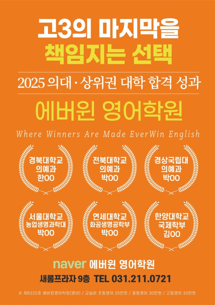 에버윈영어학원 고3 학생들이 2025학년도 수시 전형에서 뛰어난 성과를 이루었습니다. 앞으로도 에버윈영어학원은 학생들이 원하는 대학에 합격할 수 있도록 더욱 체계적이고 깊이 있는 지도를 이어가겠습니다. 합격한 모든 학생들, 진심으로 축하합니다! 수업 문의, 상담을 원하시면 아래 번호로 연락 주시기 바랍니다. 수업 문의, 상담 전화는 월~금 평일 3시부터 ~10시까지 가능합니다. 031. 211. 0721 (새롬프라자 9층) <img src="https://blogthumb.pstatic.net/MjAyNjAxMDVfMTQ5/MDAxNzY3NjE5NzY2NDE0.sY0q-YL5_hLjjQyo5Fe7zCchVPm7FzeyY8SPQHgLhMYg.I_R1oRCUb0sPAryR6Q0_kmAcyIhG431LOyJK_YSsjNIg.JPEG/KakaoTalk_20260105_222851821.jpg?type=s3" />