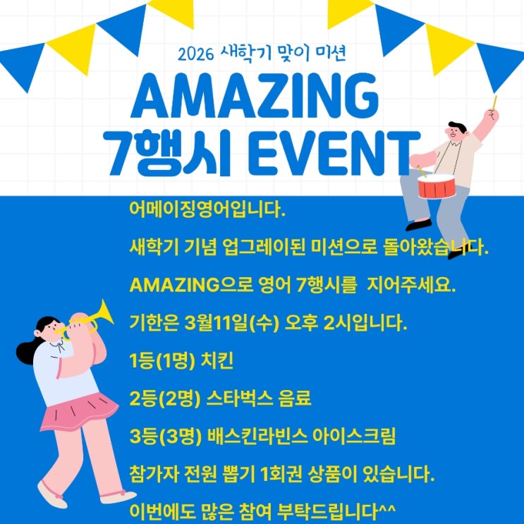 새 학기 기념 업그레이드 미션입니다.어메이징영어교습소에서 즐겁게 영어공부하는 영덕초 신성초 친구들 화이팅입니다. <img src="https://blogthumb.pstatic.net/MjAyNjAyMjZfMjgz/MDAxNzcyMDM1MzA2Nzkw.mNpZWHraEgasy3tHRF8ilFcTWnDAUA2Moa-p-NBfPjQg.yvBqio8gmZs3PMfhCw6R1U4arh_CSZQG3g5-wUQonwsg.JPEG/900%A3%DF1772019313436.jpg?type=s3" />