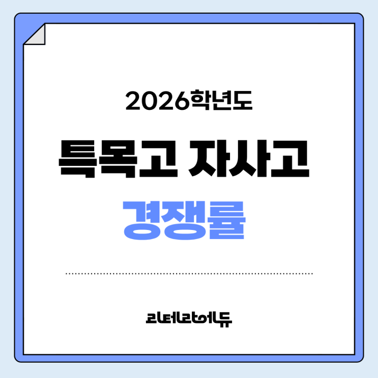 안녕하세요! 리테라에듀입니다. 오늘은 전년도 특목고 자사고 경쟁률에 대해 알아보도록 하겠습니다. 특목고나 자사고 선택을 놓고 고민하는 경우 학생의 성적과 생기부 뿐만 아니라 경쟁률의 추이에 관심을 가질 수밖에 없습니다. 고교학점제가 전면 시행된 현재 고2 학생들의 경우 여전히 대학별 전형 방향이 명확히 제시되지 않은 상황이며, 내신 5등급제에 대한 예측을 놓고 특목고 자사고 선택으로 인한 유불리를 판단하기가 쉽지 않다는 판단 때문에 전년도 특목 자사고 경쟁률은 다소 유동적이었습니다. 하지만 유형별 경쟁률 변화 추이는 주목해봐야 할 내용이 있는 만큼 올해 특목고나 자사고를 준비하는 학생이나 학부모님은 잘 살펴보....... <img src="https://blogthumb.pstatic.net/MjAyNjAzMDdfMjgx/MDAxNzcyODY5MjAzMjYx.3RLdmNDrO2Bx7STn0Fy_ZDsXprSirweC7ZOJLhw3SKcg.hgLJ3Uj8AWVCAhpYzyn7R0jKEv-1UpfZg1Zh_2poq1sg.PNG/%C1%A6%B8%F1%C0%BB_%C0%D4%B7%C2%C7%D8%C1%D6%BC%BC%BF%E4..png?type=s3" />