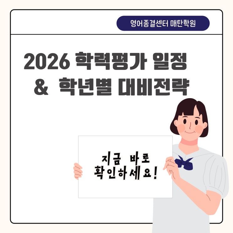 안녕하세요 영어종결센터 매탄학원입니다. 학기 초가 되면 학부모님들께 가장 많이 받는 질문이 있습니다. 학력평가는 내신에 안 들어가는데 꼭 준비해야 하나요? 고1도 벌써 수능형 시험을 대비해야 하나요? 결론부터 말씀드리면, 학력평가는 수능의 방향을 가장 먼저 보여주는 시험입니다. 그리고 학년마다 준비 포인트는 분명히 다릅니다. 오늘은 2026학년도 학력평가 일정과 함께 고1·고2·고3이 무엇을 준비해야 하는지 정리해보겠습니다. 2026학년도 학력평가 일정 고3의 6월·9월 시험은 실제 수능을 출제하는 **한국교육과정평가원**에서 출제합니다. 그래서 이 시험 결과는 수능 등급을 예측하는 가장 중요한 지표가 됩니다. ?....... <img src="https://blogthumb.pstatic.net/MjAyNjAyMjZfMTk3/MDAxNzcyMDc3MzI3MjM0.qwClx2OdS01BE2WSf-HWqSr8Rfny-HoPuCRReyuxj1Yg.okfhX-cofsaX2ykmzMAEATYicem9o1pdStQQaZd7YD8g.JPEG/_%B0%ED%B5%EE%BF%B5%BE%EE__%C7%D0%B7%C2%B0%ED%BB%E7_.jpg?type=s3" />