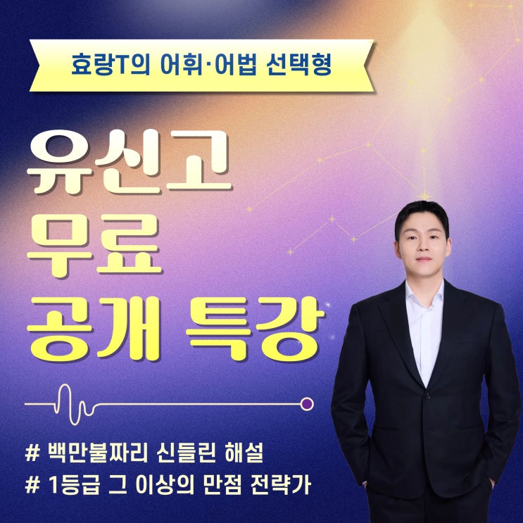 유신고의/유신고에 의한/유신고만을 위한 1등급 그 이상의 만점 전략가 효랑T가 1학기 내신 대비 <개강 인원 신기록 달성>을 기념하여 유신고 학생들의 열띤 성원에 보답하고자 교과서 1과에 대한 <어휘·어법 선택형> 특강을 마련했습니다. 유신고 내신 그 자체를 고스란히 녹여냈기에 그대로 체화하기만 하면 누구나 첫 시험 만점을 달성할 수 있습니다. 부담없는 무료 강의이지만, 전교 79등이었던 학생을 단숨에 중간 기말 모두 전교 1등으로 만든 백만불짜리 신들린 해설을 보여 드리겠습니다. 효랑 선생님 * 서울대 심리학과 수석 입학/수석 졸업 현) 시대원 광교 유신고 영어 대표 현) 담당학교 전교 1등 매년 배출 전) 메가스....... <img src="https://blogthumb.pstatic.net/MjAyNjAyMjdfMjY4/MDAxNzcyMTgyMjI1MzA2.sutsctKiNXkgflxpEH3XTmKSPVAYLzuTqSOMCRvshacg.ziX7KnQDtspb1OalRWigmVDN0ksxLQ5TjZIJ68Mun8Mg.JPEG/%C1%A6%B8%F1%C0%BB_%C0%D4%B7%C2%C7%D8%C1%D6%BC%BC%BF%E4..jpg?type=s3" />