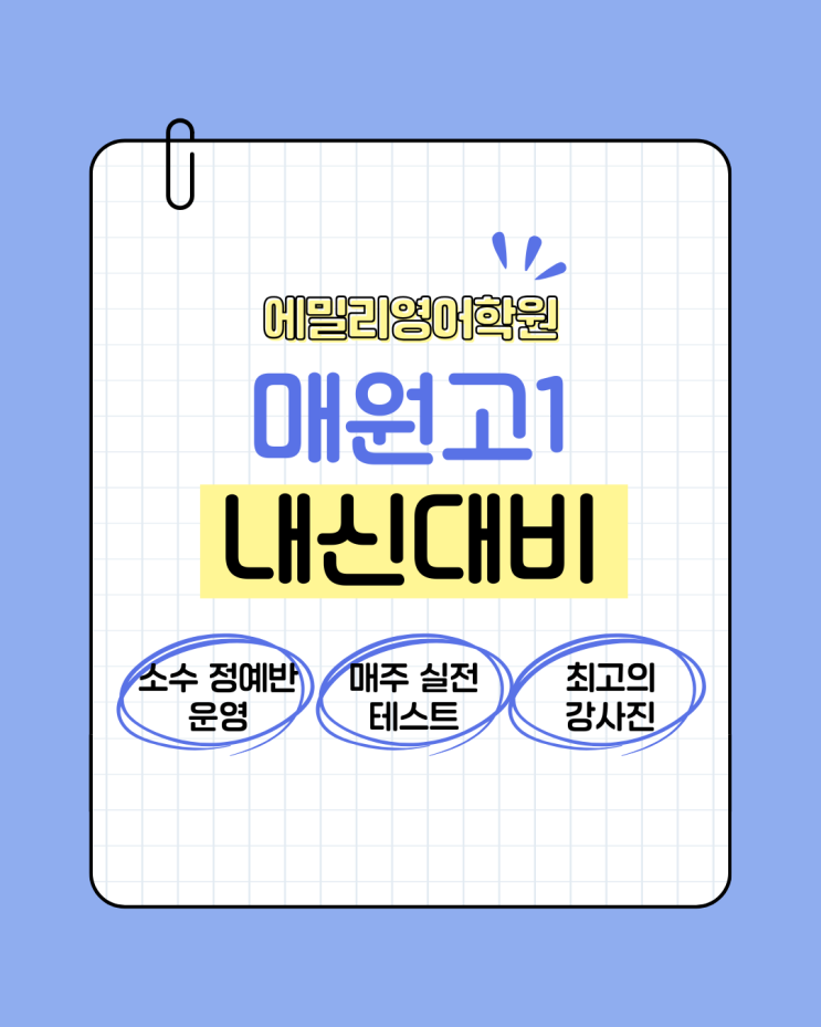 안녕하세요 프리미엄 영어학원 에밀리영어학원입니다. 매원고 영어, 왜 전략이 필요할까요? 매원고 영어는 ✔ 지문 난이도 편차 ✔ 학교 내신 특유의 문제 스타일 ✔ 서술형·어법·어휘의 디테일 이 세 가지가 핵심입니다. 단순히 문제만 많이 푼다고 해결되지 않고, 출제 의도 분석 + 반복 훈련이 꼭 필요합니다. 에밀리영어학원은 매원고 기출 및 유사 문제를 철저히 분석 시험에 나오는 포인트만 집중 공략 학생 개인별 약점을 정확히 짚어 지도합니다. ✏️ 내신 대비, 이렇게 다릅니다 * 교과서 & 부교재 지문 완벽 해석 * 시험에 자주 나오는 어휘·어법 정리 * 서술형 대비 문장 구조 훈련 * 학교 스타일에 맞춘 실....... <img src="https://blogthumb.pstatic.net/MjAyNjAxMTVfMjgg/MDAxNzY4NDYyMTMyODI4.WejjcwXauMlgJ_GxF2epfZK7Cn2I8XkVNuVuiaTLaPsg.eER3BBw9ZfQQgzshs5kT4HZMlFK2DwvKZnCt2J49rP8g.PNG/%BA%ED%B7%E7_%B1%F2%B2%FB%C7%D1_%B3%BB%BD%C5%C6%AF%B0%AD_%C7%D0%BF%F8_%C8%AB%BA%B8_%C0%CE%BD%BA%C5%B8%B1%D7%B7%A5_%C6%F7%BD%BA%C6%AE_%282%29.png?type=s3" />