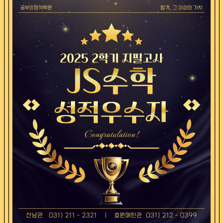 안녕하세요! 수원 매탄동 중고등 입시전문학원 공부의정석학원입니다. 오늘은 2026년도 매원고 / 효원고 / 매탄고 / 권선고 / 화홍고 내신반 (과목별 / 학교별 개강일 다름 : 문의해주세요) 개강소식을 알리면서 동시에 2025년도 2학기 공부의정석 재원생들 중, 수학 성적 우수자를 공지해드리려고 합니다 ! 그럼 함께 살펴보시죠✨ 수학과목을 공부하는 방법 수학 과목을 잘 공부하기 위해서는 문제를 많이 푸는 것보다 개념을 정확히 이해하고 사고 과정을 체계화하는 학습이 중요합니다. 수학은 공식 암기 과목이 아니라, 개념 간의 관계를 이해하고 이를 문제 상황에 적용하는 과목이기 때문인데요, 먼저 개념 학습이 최우선입니다. 교과서에....... <img src="https://blogthumb.pstatic.net/MjAyNjAxMjFfNDAg/MDAxNzY4OTg2NjU5NDgy.gq7WzlgFW2xJF1oDXUSLNWk5xUZ6kJxmljayjdCv6fEg.zwQorFOadachEaYQwZNulWLSSftyo4sN3KovbQHQocsg.PNG/003.png?type=s3" />