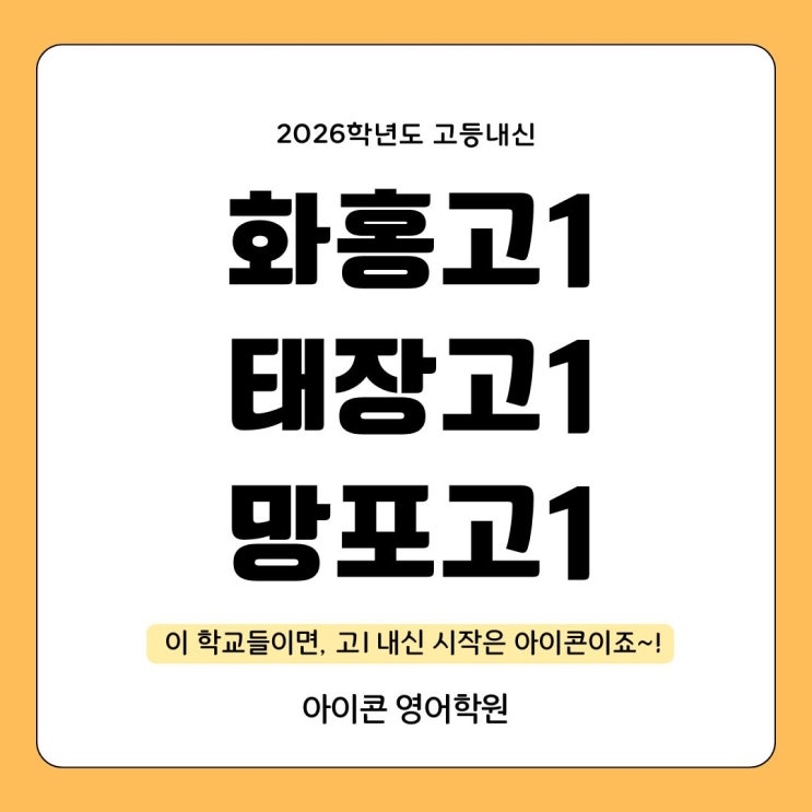 안녕하세요 아이콘영어학원입니다. 드디어 내일, 고1 학생들의 배정 고등학교가 발표되는 날이네요. 설렘도 있고, 앞으로의 공부가 걱정되기도 하는 시기인 것 같아요. 2026 고등 내신 준비, 어떻게 시작해야 할까요? 아이콘영어학원은 화홍고·태장고·망포고를 중심으로 학교별 내신 흐름에 맞춘 수업을 진행하고 있습니다. 고등 영어는 수업을 성실히 듣는 것도 중요하지만, 그 이후의 복습·과제·오답 정리까지 어떻게 관리되느냐에 따라 결과가 달라지는 경우를 많이 보게 됩니다. 아이콘영어학원은 <화홍고·태장고·망포고> 학생들을 중심으로 학교별 내신 흐름에 맞춰 수업을 진행하고 있습니다. 특히 학생 관리가 꼼꼼한 학원으로....... <img src="https://blogthumb.pstatic.net/MjAyNjAxMjJfMTcg/MDAxNzY5MDgyNTM1NTk4.DLj2dUiIvTa5NGlxkjrpWaA6l1zHvQUHDEBcrez-FOcg.lAzs7X8KmBm4vJZiYPGjW1RzEAs-Ew5RKumy_gGbYrgg.JPEG/%BF%AC%B5%CE%BB%F6_%BD%C9%C7%C3%C7%D1_%BA%EA%B6%F3%BF%EC%C0%FA_%C1%A4%BA%B8_%C0%FC%B4%DE_%C4%AB%B5%E5%B4%BA%BD%BA.jpg?type=s3" />