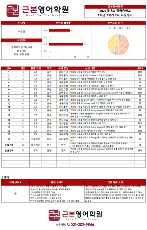 [ 청명중 영어학원 ] 2025 청명중학교 2학년 2학기 2차 지필평가 심층분석 #근본영어