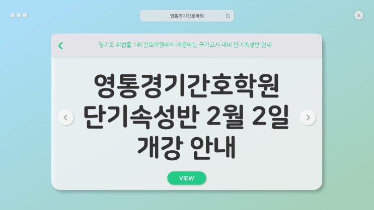수원, 용인, 화성 등등 지역에서 간호조무사를 꿈꾸는 분 계신가요? 그렇다면 영통경기간호학원으로 오세요 ~ 2월 2일 개강을 앞둔 26년 9월 시험 대비 단기속성반이 준비 되어 있답니다 ! 영통경기간호학원은 우리 지역에서 여러모로 뛰어난 학원입니다 ^^ 높은 국가고시 합격률과 높은 취업률 그리고 친절하고 전문적인 강사 선생님들까지 모두 갖춘 학원이랍니다. 상담 문의는 031-258-6624 연락주세요 ~ 단기속성반 프로그램은 짧고 효율적인 8개월 속성으로 기초부터 실무까지 완벽하게 대비 해 드립니다 ! 개인별 학습 수준에 맞춰 취약 과목 보강 학습까지 ! 국가고시 대비 특강과 모의고사로 높은 합격률 보장 ! 간호조무사 국가고시 26년....... <img src="https://blogthumb.pstatic.net/MjAyNTEyMzBfODEg/MDAxNzY3MDU4Mzc1MjE5.6wXUErihJAUcBAlLKADVg29kpvijVYsxQgdMANKT3Acg.e7t2m-rT_U34cH0f4ufoNuA45RgaylvBHOOQ_zKpks4g.JPEG/1.jpg?type=s3" />