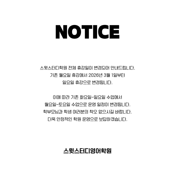휴강일 변경 안내입니다. <img src="https://blogthumb.pstatic.net/MjAyNjAyMjRfMjQx/MDAxNzcxOTI2NTc5MTQw.Ic-YE6irpswV8qA9ROPM0FRE6hBybDHuNOLSjur8FvIg.YDwUzS5n_xwdmsN5eK-xFLSNxKzJp79xCDkx2oSb-1sg.PNG/4.png?type=s3" />