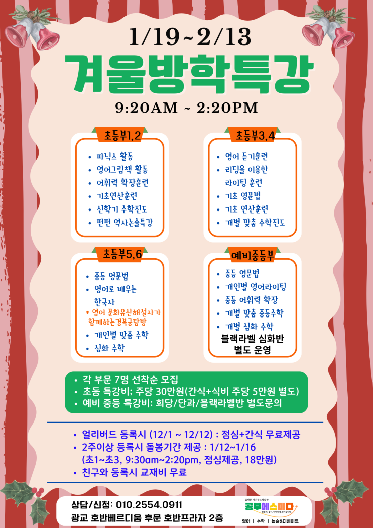 우리 아이들의 공부습관이 자연스럽게 스며드는 곳, <공부에스미다>학습관입니다. 날씨가 부척 주워진 요즘, 어느덧 긴 겨울방학이 다가오고 있습니다. "밖은 너무 춥고, 집에서만 보내기엔 시간이 너무 아까운데....." "이번 방학을 알차게 보내고 우리 아이 학습 성취감도 느낄 방법이 없을까?" 고민하시는 학부모님들을 위해, 알차지만 힘들지 않고 꼭 필요한 것만 쏙쏙~ 채우는 <공부에스미다>만의 겨울방학 특강프로그램을 소개합니다. ^^ <공부에스미다가>가 왜 특별한가요??? 진심을 다하는 전문 영어, 수학, 논술 강사진들이 직접 개인별 맞춤 수업은 물론 자기수도 학습 훈련까지 시켜주니까요! ....... <img src="https://blogthumb.pstatic.net/MjAyNTEyMjNfMTk5/MDAxNzY2NDY3NTk1OTk1.-uWd0_JoMrG76pbYUWaUv_5I6HiYTdpwbnFkejUEkz4g.d7DxCRrh6ZGF4VYSvD23pTNnqDVVHd3DjXHIaSWWmLUg.PNG/26%B0%DC%BF%EF%C6%AF%B0%AD.png?type=s3" />