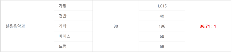 안녕하세요~ 오늘은 명지전문대학교 실용음악과의 2026학년도 수시 및 정시 경쟁률을 살펴보도록 하겠습니다 명지전문대학교 실용음악과는 2026학년도 수시 1차 때 38명 모집에 가창 1,015명, 건반 48명, 기타 196명, 베이스 68명, 드럼 68명이 지원하였고 평균 36.71:1의 경쟁률을 보이고 있습니다. 명지전문대학교 실용음악과는 수시 2차 모집을 진행하였으나 1명 모집으로 인해 지원자가 아무도 없었습니다 명지전문대학교 실용음악과는 수시 2차 때 모집되지 않은 1명을 포함하여 정시 때 총 12명을 모집하였고 가창 947명, 건반 63명, 기타 197명, 베이스 90명 드럼 101명 지원하였고 116.5:1의 경쟁률을 보이고 있습니다. 수시....... <img src="https://blogthumb.pstatic.net/MjAyNjAzMDNfMjcw/MDAxNzcyNTI5OTg0MTk0.J9Q4f0luDx0MyOrBbced6sl_DJwar72dO_ciTdalg2sg.vVPyRQmBArfpKff4htiUHY87TYalZ8FLRIJM6M3zz_sg.PNG/image.png?type=s3" />
