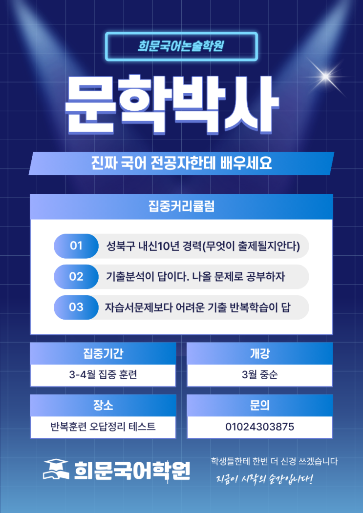 강북종로학원(성북) 2027 N수 학습전략 설명회 " 재수, 학습 습관을 바꾸지 못하면 결과는 바뀌지 않습니다" 일자 : 3월 7일(토) 오후 5시 장소 : 강북종로학원(성북) 세미나실(4호선 길음역 9번 출구, 미아현대백점 옆) 예약 : https://bit.ly/4l4u7V0 ※ 본 설명회는 현장 설명회로만 진행 합니다. 강북종로학원(성북) §§ 연사 §§