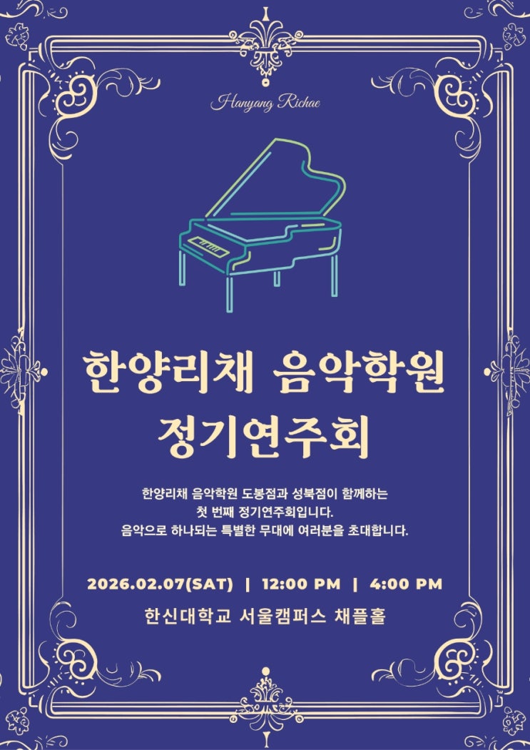 한양리채 음악학원 도봉점과 성북점이 함께하는 첫번째 정기연주회입니다. ✔️2월 7일 토요일 ✔️한신대학교 서울캠퍼스 ✔️1부: 12시 ✔️2부: 4시 많은 관심 부탁드려요 :) #길음뉴타운피아노학원 #길음동피아노학원 #길음성인피아노 #길음유아피아노 #도봉구피아노입시 #성북구피아노입시 #미아초등학교 #영훈초등학교 #매원초등학교 #우촌초등학교 #성신초등학교 #한신초등학교 #동북초등학교 <img src="https://blogthumb.pstatic.net/MjAyNjAyMDRfMjY0/MDAxNzcwMTcwOTM0ODAx.atosnjbKZU4Lbr3Ijif8KnAhIdTV6Ybb1k7BoGw2WEUg.JL1IjyJwtQxAu-uCZN1gAdt7rqwrHvgERBMUhUsP8sgg.JPEG/900%A3%DF1769685208235.jpg?type=s3" />
