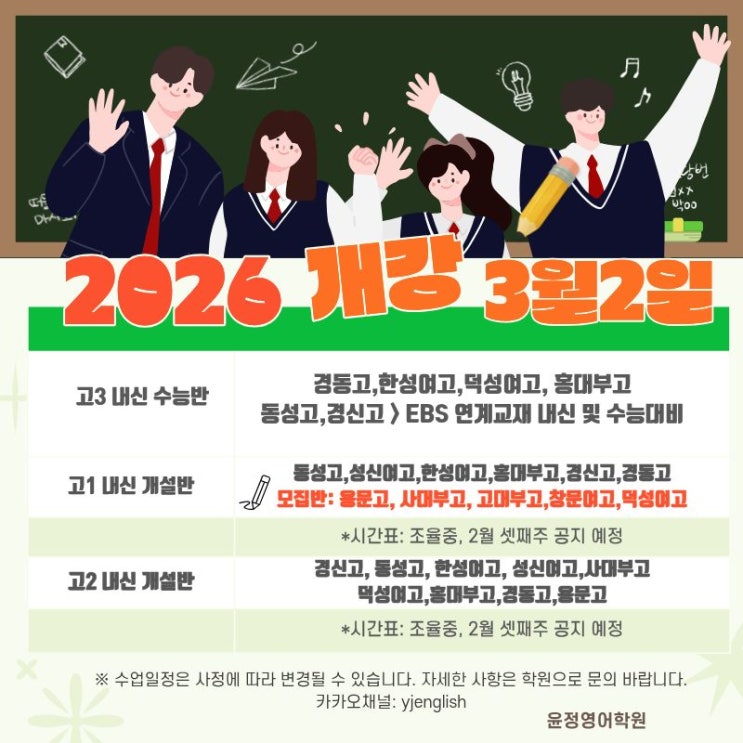 #킴스영어전문학원 #중계동영어학원 #고등학교내신 #수능 #고등학생영어학원 #고등부영어 #입시 #수능영어 #성적향상 #입시영어 #서울영어학원 #예비고1 #모의고사 #대입준비 #내신대비 #영어전문학원 #청원여자고등학교 #영신여자고등학교 #청원여고영어 #영신여고영어 #고등내신 킴스영어 중계 3호점 영신여고 1 청원여고 1 고등 내신 전문반 오픈 ! 안녕하세요, 킴스영어학원입니다. 킴스는 종암 1호점, 길음 2호점, 중계 3호점으로 총 3개 지점으로 운영되는 입시 영어 전문 학원입니다. 매년 재원생들의 고등 입학 결과에 따라 킴스는 지점별로 고등 내신 전문반을 운영하고 있습니다. 올해 중계 3호점에서는, 청원여고와 영신여고 내신반을....... <img src="https://blogthumb.pstatic.net/MjAyNjAyMDJfMjU1/MDAxNzcwMDE4MTcwMjU0.q63UKVAUrkGFv2vSjacW59vzK00gNbV9WzmhKTT-jiMg.nTNiQ8aRhi3LSS3d31G_rAzgftm8ADk9GcdMMGF29Aog.JPEG/1.jpg?type=s3" />